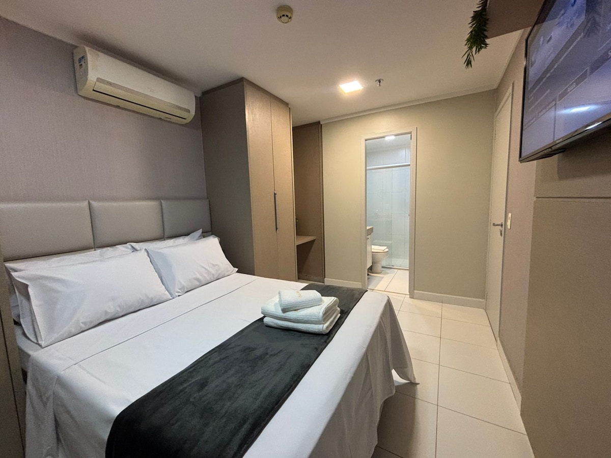 Loft de alta gama. Cama Queen de hospitalidad americana, colchón de muelles y látex. Cocina completa para cocinar con varios electrodomésticos. Tiene aire acondicionado Ideal para trabajar: escritorio, silla ergonómica, wifi de alta velocidad (400 Mb). Se proporcionan toallas y sábanas. Es necesario enviar el documento de identificación del huésped, que solo pueden entrar al condominio con los datos de este documento.