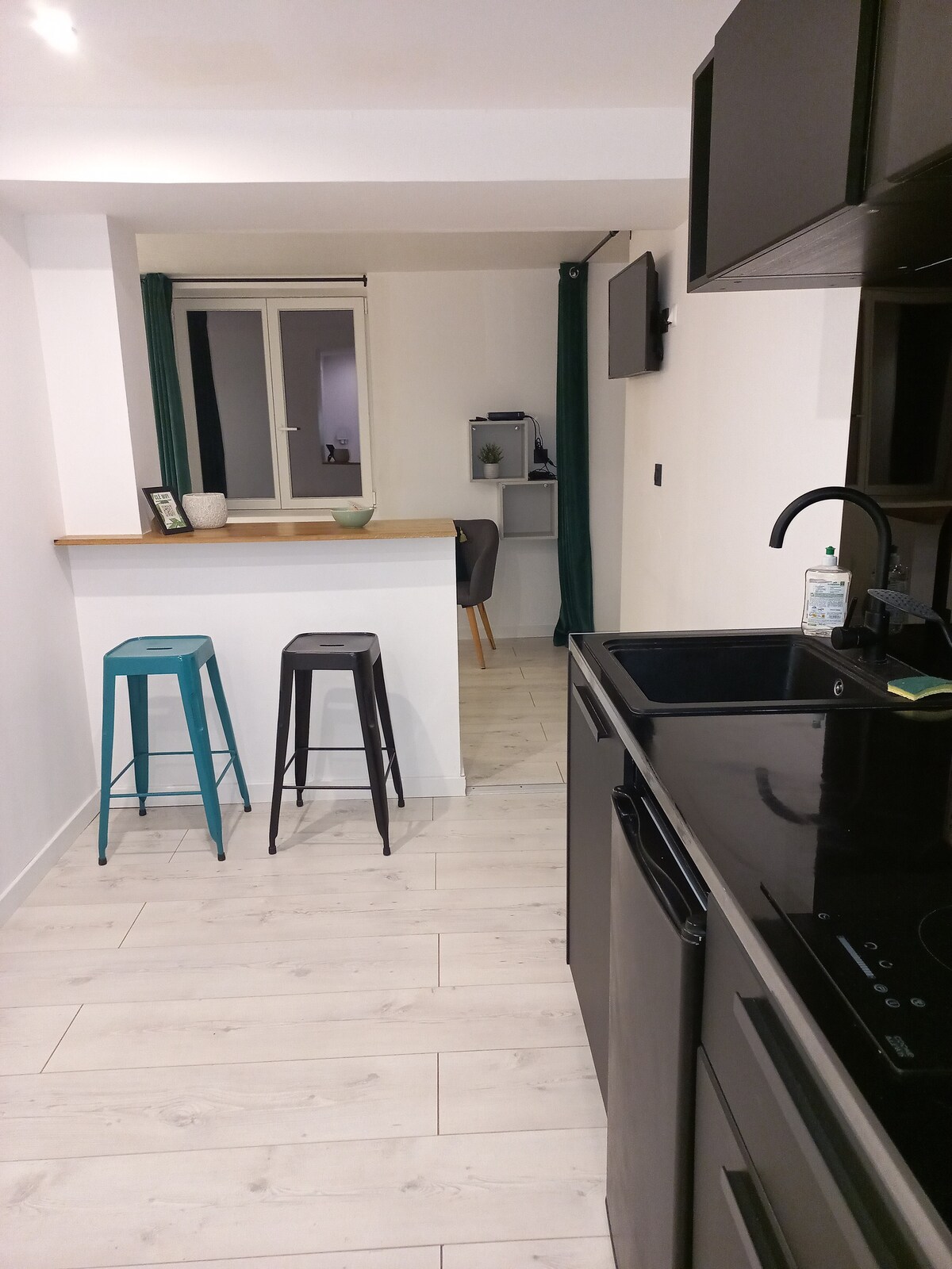 En la propiedad a 500 m del centro de la puerta eléctrica aparcamiento en el sitio hermoso estudio nuevo y moderno independiente con una cocina totalmente equipada hermosa vajilla un bar con 2 taburetes una cama grande 160 lencería d hotel una oficina de esquina internet tv un vestidor sofá armario y armarios un cuarto de baño suelo de mármol y paredes un lavabo secador de pelo una gran ducha un inodoro suspendido persiana eléctrica el diseño es moderno