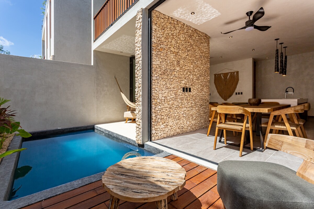 Vive lo mejor de la elegancia al estilo Tulum en nuestra residencia Boho Chic, donde se combinan el diseño y comodidad. Nuestra Villa es una casa única y lujosa de 2 recámaras y 2 baños, con alberca privada, tina exterior y un diseño galardonado inspirado en la arquitectura maya. Cuenta con cocina totalmente equipada, WiFi rápido, concierge y todos los servicios adicionales que necesites. Descubre una mezcla perfecta de estilo y privacidad para una estancia inolvidable en el corazón de Tulum.