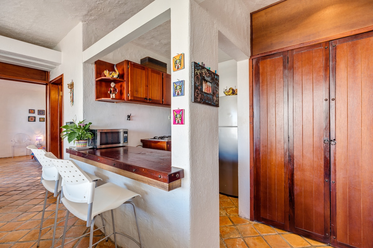 Departamento ubicado en el corazón de la Zona Romántica, a tres minutos caminando al muelle de la Playa de los Muertos y a la zona de restaurantes y bares de Olas Altas. Cuenta con: cocineta, habitación principal con cama King Size, tv y sofá cama, Apple TV, sala amueblada con cama sencilla y vista al mar, Wifi y aire acondicionado en ambos ambientes, terraza con comedor y piscina en área común. Estacionamiento propio.