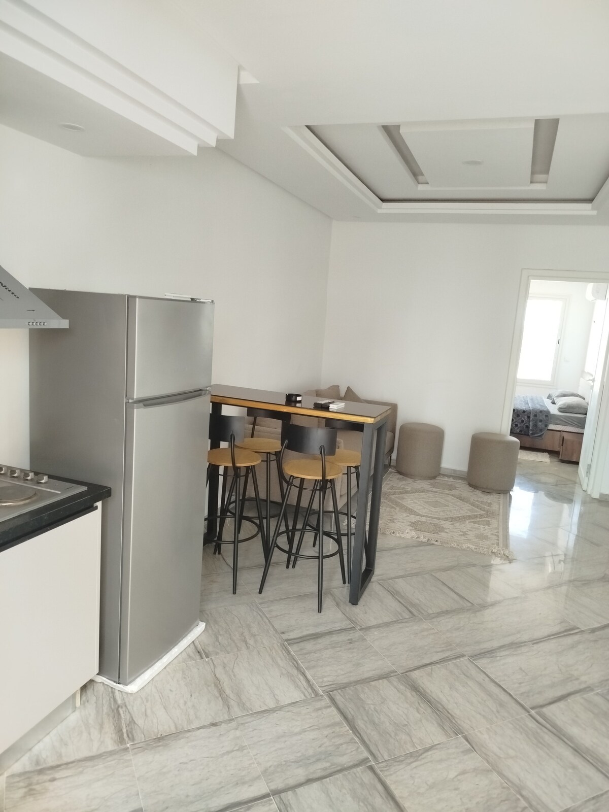 Apartamento S+1 de alto standing en planta baja, situado a 500 metros de la playa de Aghir y a 5 km del centro de Midoun. Es un bonito apartamento en el corazón de la zona turística de Aghir cerca de todos los servicios y lugares de interés, muy bien orientado, situado en la planta baja que consta de una cocina americana con sala de estar y bonito dormitorio, en una residencia privada, tranquila, segura, un jardín con césped y aparcamiento privado. Con aire acondicionado disponible en todas las habitaciones.