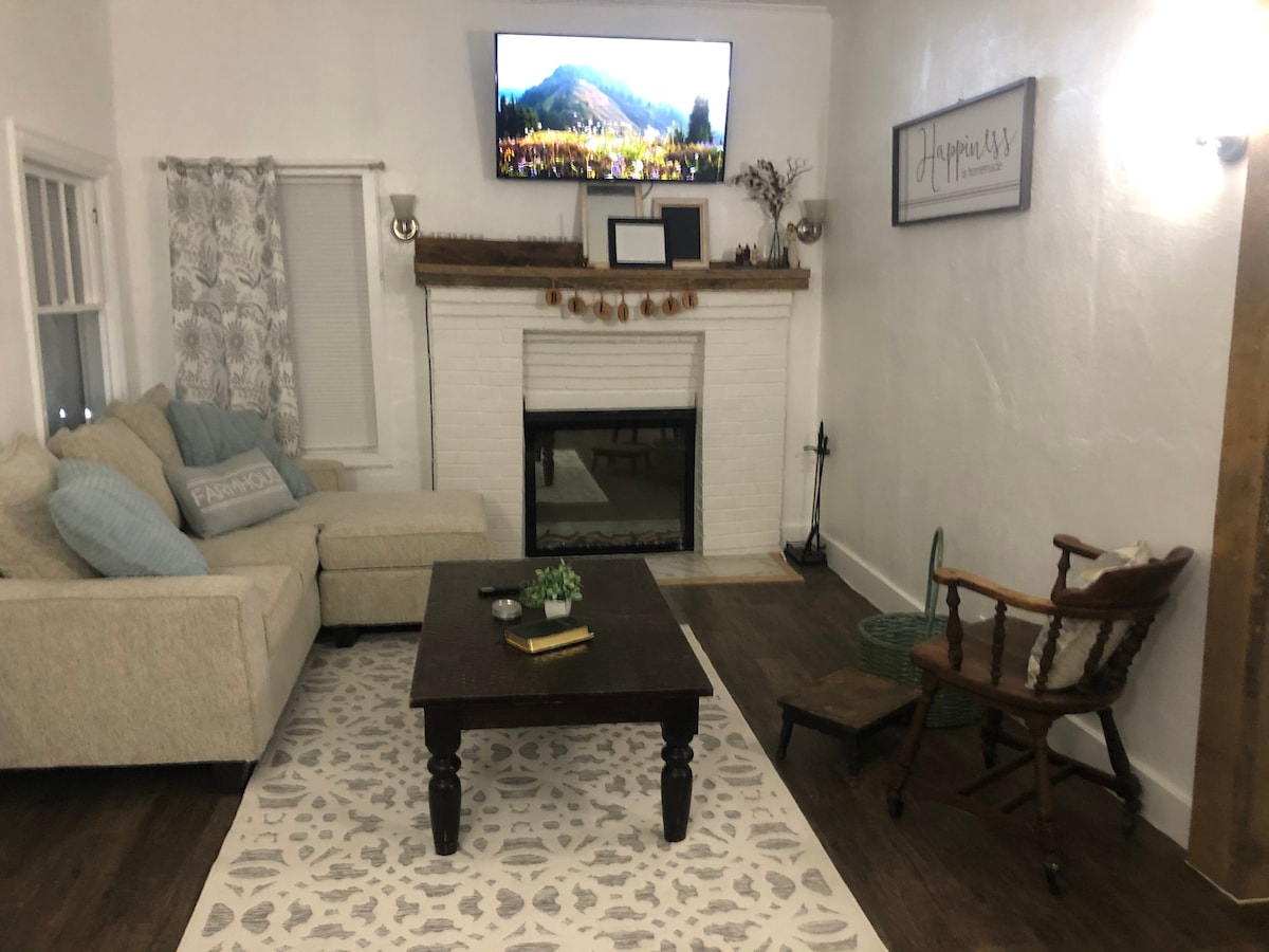 Walk into the door of a old country farmhouse it feels kinda like grandmas. With warm touches, antiques and a unique twist of modern along with old floors, sweet treats and quilts. It is comforting to sit by a modern fireplace and a relaxing countryside. A big desk space in the kitchen if you need a workspace. Come and sit down and take the pressure off of life kicking back at this Grandma’s farmhouse special.
