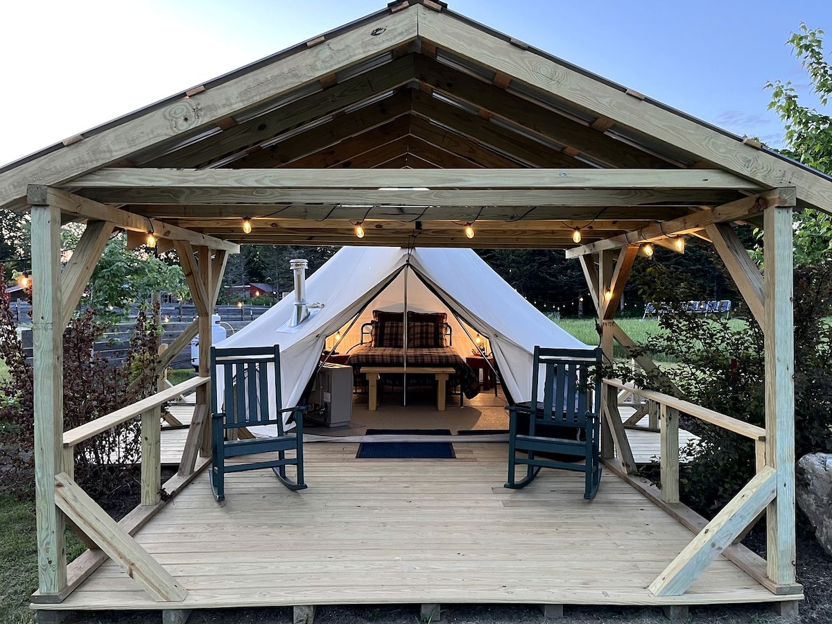 Glamping con vistas a la montaña en Maine: tienda de campaña y pabellón
