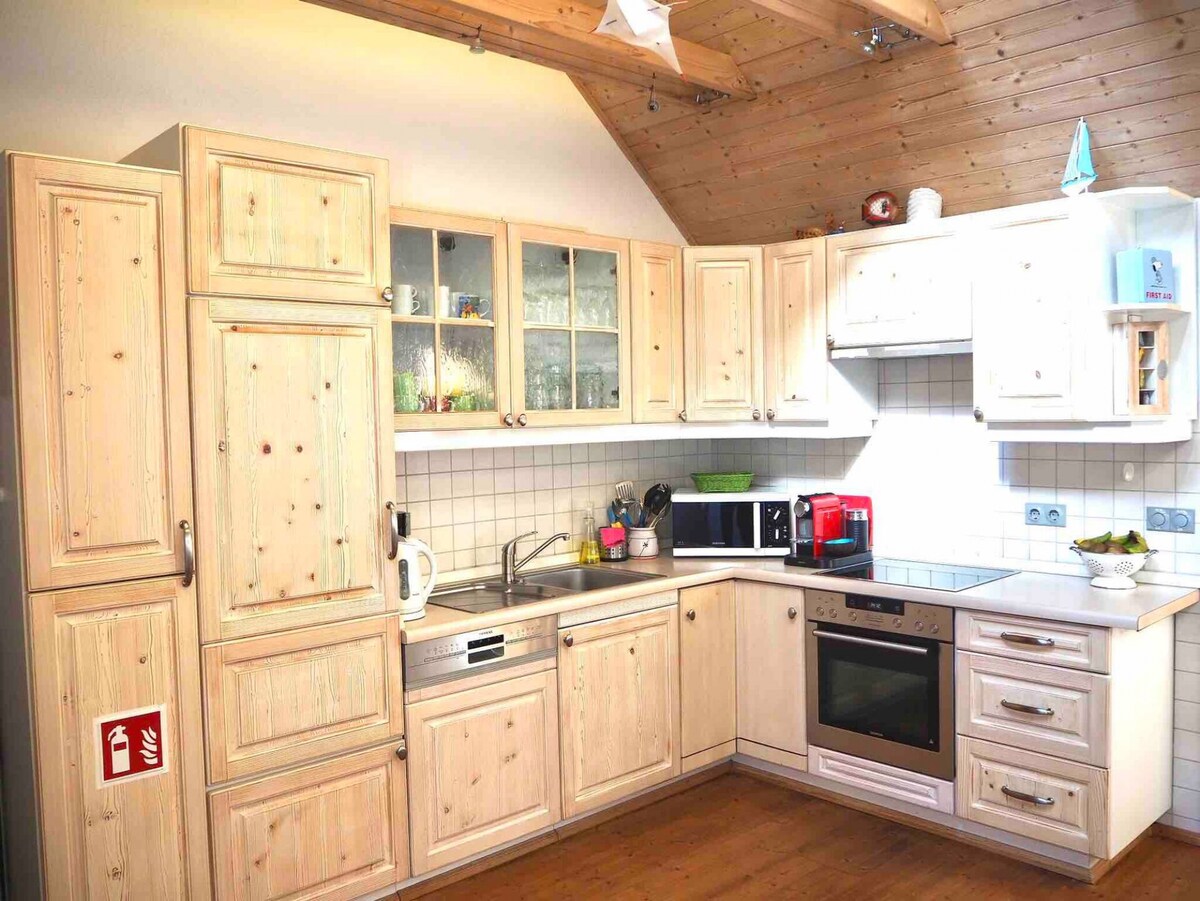 Apartamento, en el primer piso, dos zonas de descanso abiertas (sin habitaciones cerradas) con techo de escalera, balcones en todas las direcciones. ¡Una empinada escalera conduce al techo para dormir! Sin embargo, el sofá cama doble está en la zona de estar inferior. Zona de jardín con chimenea, sauna al aire libre. Cocina totalmente equipada, con cocina de gas. Hay especias disponibles, pero tienes que traer tu propio café. En verano, el agua de servicio se calienta a través del sistema solar. Puede que la calefacción tarde un poco en ponerse en marcha en Wolken.