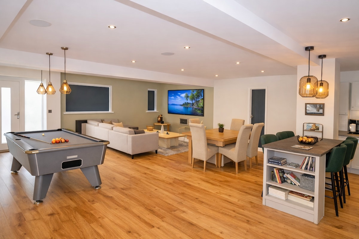 Grove Lodge is a modern, peaceful, Somerset retreat close to Bath, Wells and Bristol. The spacious open plan living area features a full size pool table, 75" TV and full sound system perfect for watching your favorite movies and sports, plus a fully equipped kitchen and dining space makes it the ideal place for entertaining. Upstairs offers a large double bedroom, two good size single bedrooms and bathroom. Easy-onsite parking for multiple vehicles for a hassle free stay.