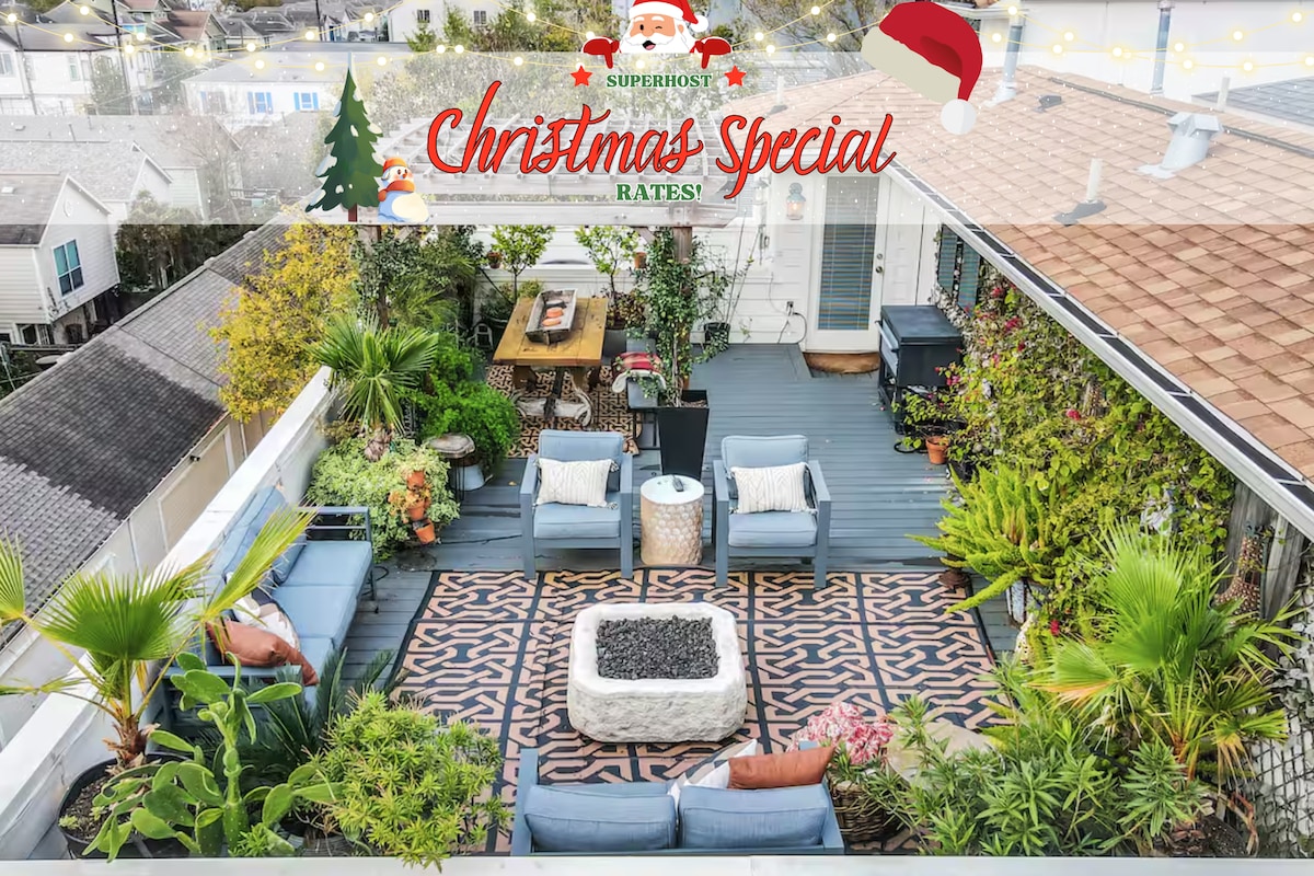 We are just north of downtown Houston and 1/2 mile (4 min) away from White Oak Music Hall. Ride shares are never more than a few minutes away. There is free on-site parking with a private driveway secured with an automatic gate. The Metro light-rail is only 2 blocks away and provides direct access to U of H Downtown, Downtown, Midtown, Medical Center, NRG Stadium, and more. We offer comfortable outdoor furniture with fire pits & lighting. A griddle, grill, and pellet smoker are all available.