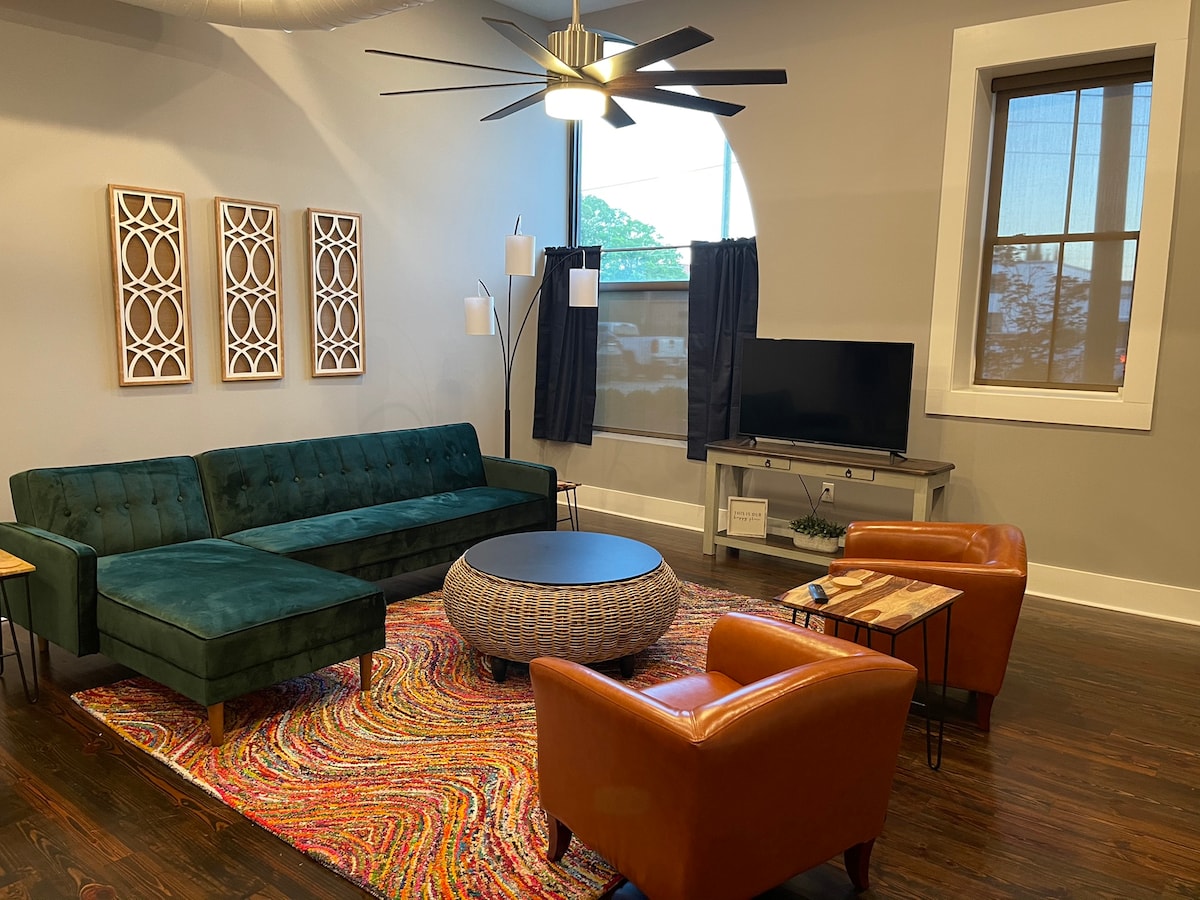 Este loft bohemio y elegante se encuentra en el corazón del centro de Macon. Disfruta de bares y buena comida, a poca distancia a pie de la vida nocturna de Macon. Ideal para que las parejas se alojen durante un fin de semana largo, para los huéspedes que viajan por trabajo e incluso para aquellos que solo pasan por Macon hasta su destino final. Este loft ofrece habitaciones espaciosas que incluyen un dormitorio con cama tamaño king y sofá cama en la sala de estar con capacidad para hasta 4 personas. Tanto la sala de estar como el dormitorio tienen televisores con Roku.