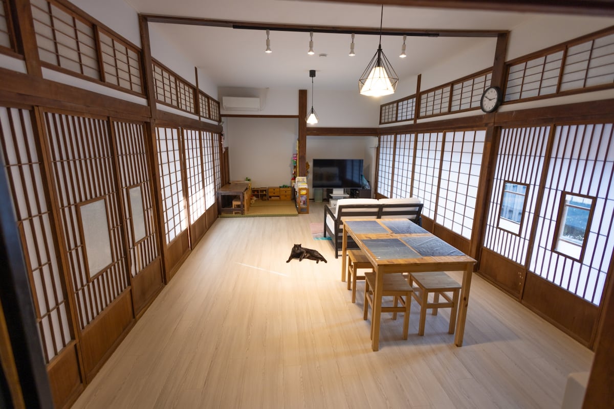 Nuestra casa es una casa tradicional de estilo japonés. Tiene 150 años y está en una ubicación muy tranquila. Estamos alquilando una casa. No se comparte con otros huéspedes. Hay 2 dormitorios (habitación Tatami) y 1 sala de estar, sala de juegos, baño, inodoro con ducha, todas las habitaciones son solo para ti. *Los niños no pagan si no necesitan cama y desayuno. Hay aire acondicionado en el dormitorio y en la sala de estar.
