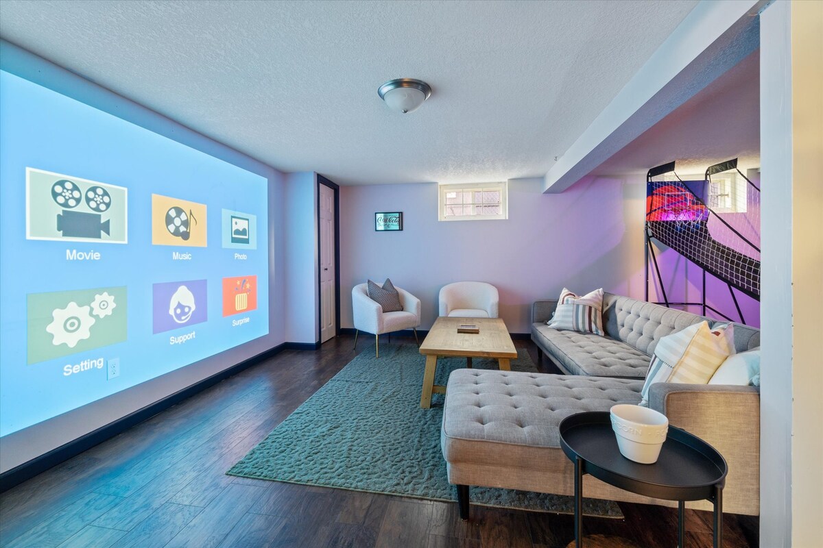 Cine ★privado con patio trasero totalmente vallado★ 6 dormitorios, 2 salas de estar con cine de 700 pies cuadrados equipado con 12 asientos de estadio de fútbol, pantalla 4K de 100 pulgadas y altavoces Dolby Atmos en una ubicación conveniente y SEGURA. 2 entradas para coches y calle de un solo sentido frente a la propiedad proporcionan una gran privacidad y un fácil estacionamiento para un grupo grande. Cerca de todo lo que ofrece Minneapolis. A 7 minutos del centro de la ciudad, a 8 minutos del estadio U.S. Bank y a 5 minutos del aeropuerto MSP. Limpieza profesional y equipo de servicio 24/7.