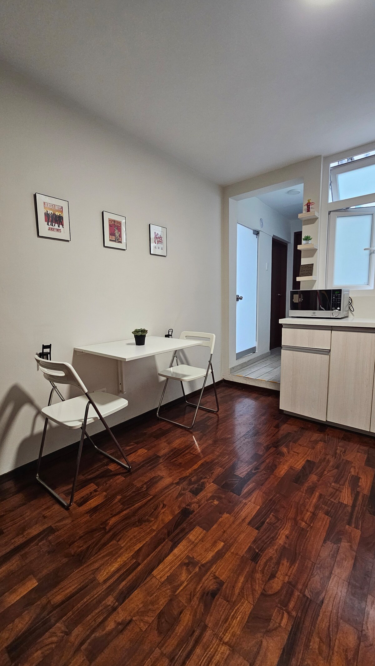 El Mini/departamento es confortable para 1 huésped, cama dos plazas/ matrimonial , amplio closet para estancias largas, un escritorio para trabajar y un televisor. Kitchenette con una cocina eléctrica de una hornilla, (COMIDA LIGHT) porque el ESPACIO ES PEQUEÑO Y CERRADO, una mesa abatible con 2 sillas, hervidor eléctrico, un frio- bar, licuadora personal, microondas, un mini grill y menaje. Un baño amplio con ducha eléctrica. El lugar seguro. Entrada independ. 2do. piso.