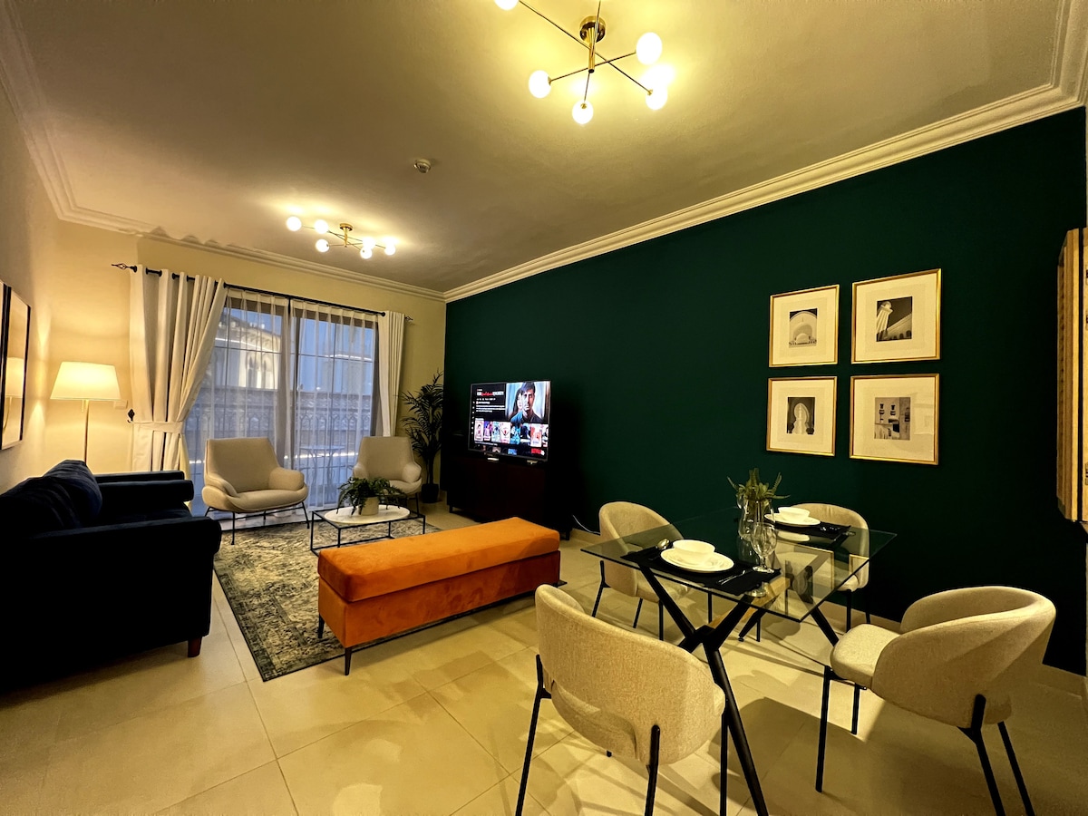 Disfruta de una experiencia de lujo en este céntrico alojamiento. Relájate y desconecta en esta tranquila y elegante morada. El lugar está lleno de características y te da la oportunidad de alojarte en la comunidad verde con vistas al Burj Khalifa, precioso apartamento de 1 dormitorio con todas las comodidades. Disfruta del tranquilo y exuberante paisaje verde. El sitio A ☑️10 minutos del Burj Khalifa, del centro comercial Dubai Mall y de la carretera SHZ. A ☑️14 minutos de los aeropuertos de Dubái. A ☑️10 minutos del Santuario de Vida Silvestre Ras Al Khor. A ☑️18 minutos de Palm Jumeirah.