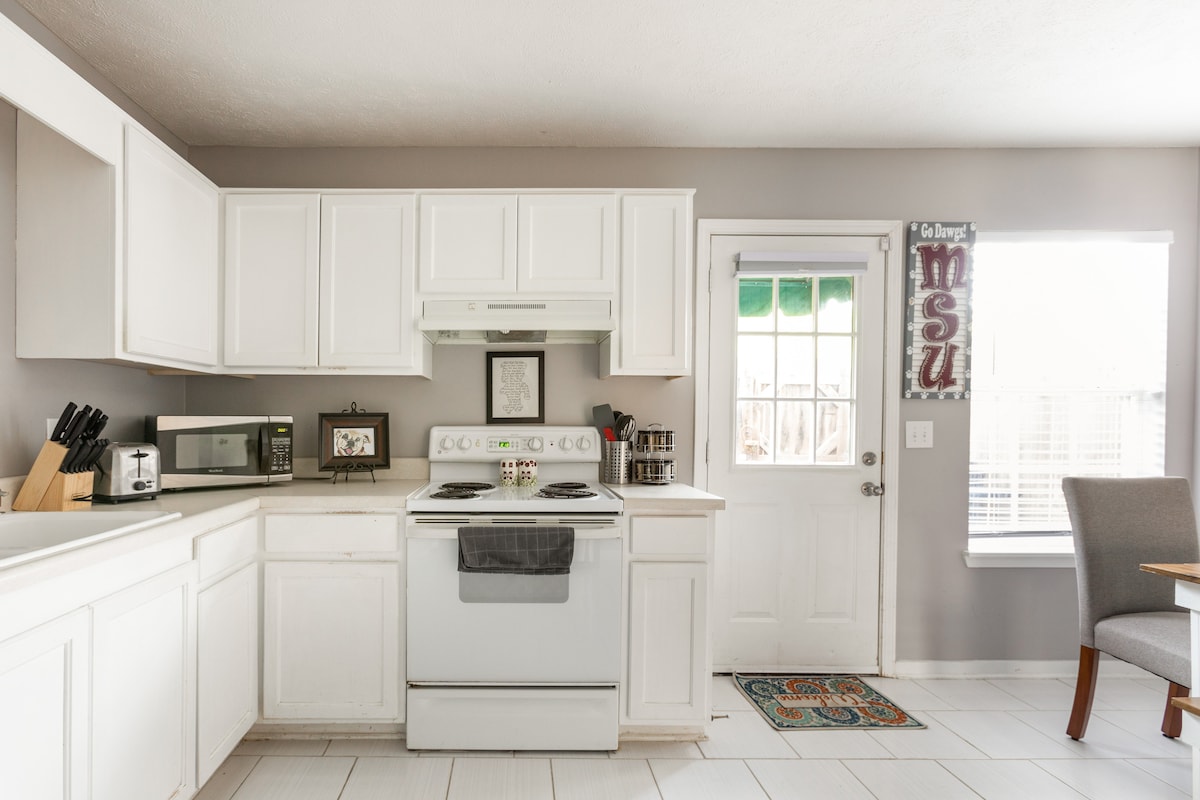 ¡Te damos la bienvenida a la fabulosa Starkvegas! ¡Tenemos el «hogar lejos de casa» perfecto de 1800 pies cuadrados! Ofrecemos un excelente entorno de «trabajo desde casa» con wifi rápido y fiable y dos áreas de trabajo/escritorios. También nos encanta compartir nuestro segundo hogar con los aficionados de los Bulldog y los aficionados del equipo visitante por igual. Nuestra casa es perfecta para visitar a familiares y amigos o cuando estás en la ciudad por negocios a corto plazo o prolongados. Sea cual sea tu razón para venir a Starkville, queremos que tengas una experiencia personal y cómoda.