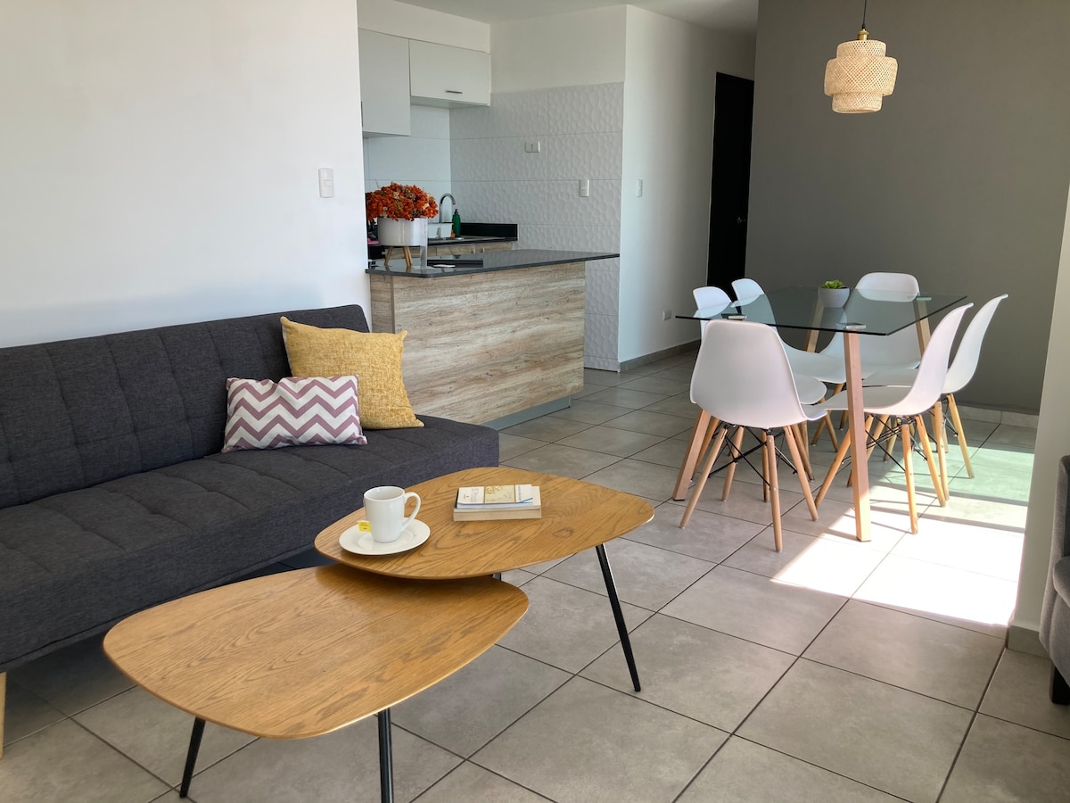 Apartamento entero tipo Loft. Cuenta con una hermosa terraza, 1 dormitorio abierto con cama Queen y A/C, baño privado , sala, comedor y cocineta totalmente equipada, lavadora y secadora de ropa. Con smart TV de 58" para entretenimiento y wifi. Incluye 1 parqueo gratuito en las instalaciones.