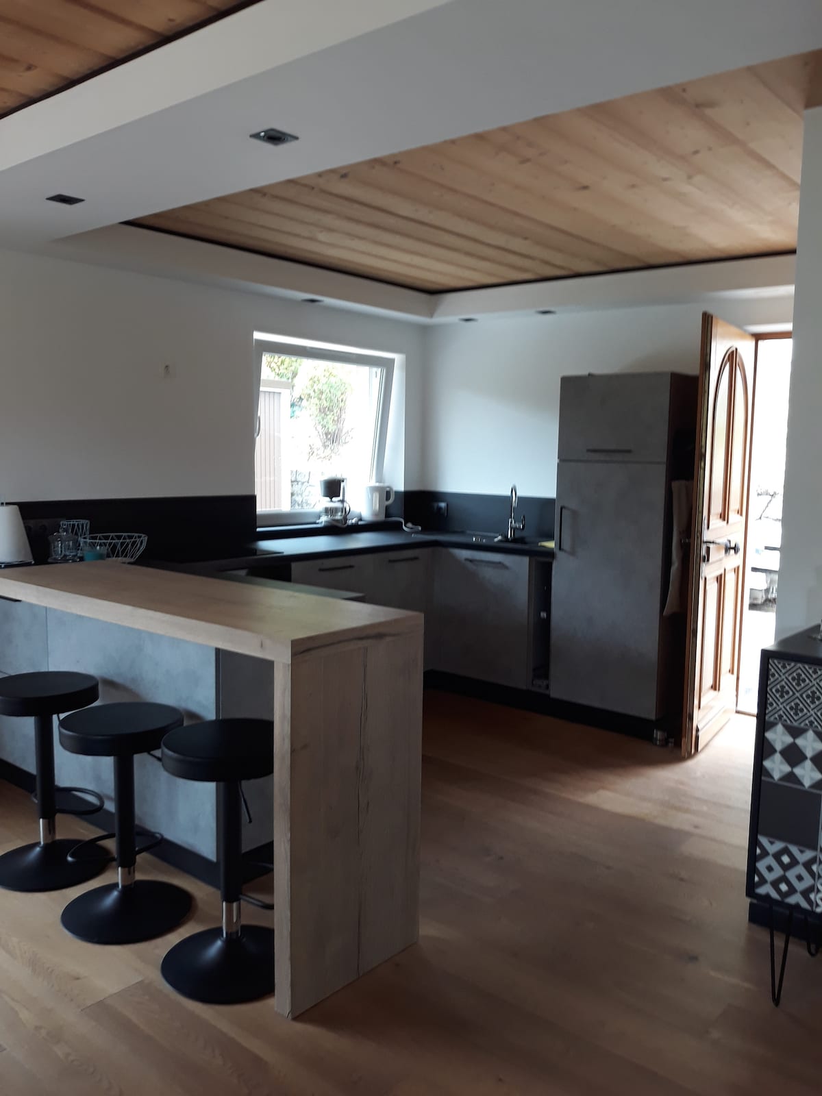 La Grange de Guew es una casa rural con encanto de 95 m2 totalmente renovada a estrenar 1 habitación privada jacuzzi y sauna con ducha Arriba 1 dormitorio muy amplio de 22 m2 con cama King size (180 ) 1 red de descanso. 1 gran vestidor 1 baño con ducha 1 aseo, 1 salón con TV y wifi gratuito, gran sofá, todo abierto a la cocina totalmente equipada, estufa de pellets, 1 terraza privada ( mesa de jardín y tumbonas). La casa no es apta para niños de 2 a 17 años