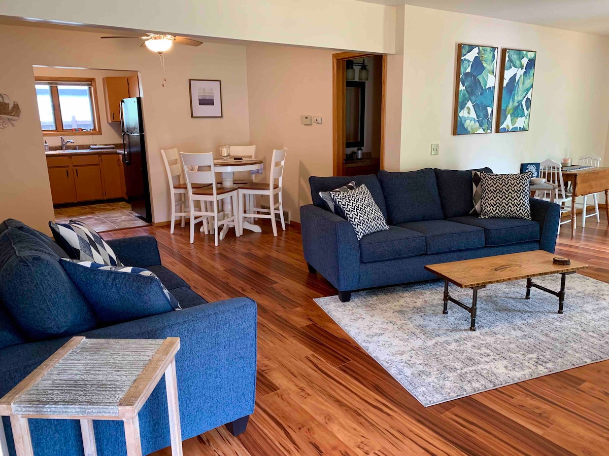 Enjoy everything Madison has to offer, then return to our quiet neighborhood and the peaceful pond behind your cozy, comfortable, two-bedroom, lower-level apartment with a private entrance, retro kitchenette, full bath, WI-FI, Roku TV, and CAC. There's a bike/walking path just across the pond, you'll be close to Lake Monona, and the Capitol and UW-Madison are just four miles away. No matter the season, we encourage guests to step outside, take a deep breath, and enjoy the natural surroundings.