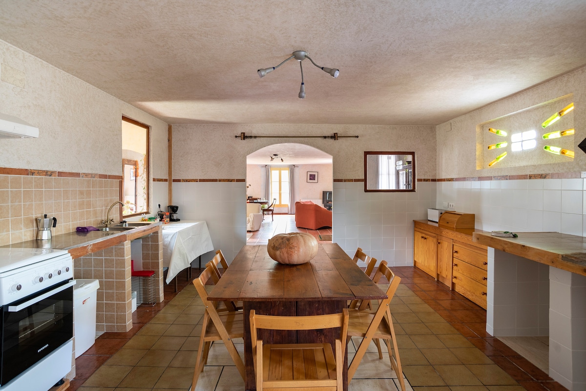 Alquiler casa completa/3000m2 en exteriores. Naturaleza, tranquilidad, pueblo bien comunicado, piscina, arte, huerto. El total de huéspedes es 11/no puede excederse, alquilamos por huésped/+ huéspedes/eventos/consultar.Piscina agua salada del tiempo, disponible todo el año. Suite 1, 2 y 3 con baños privados. Las fiestas del pueblo son primer fin de semana de agosto o fin julio. A 1h 30min/playa - 1h 30min/pistas de esquí. Con 2 huéspedes + bebé/niño pequeño usamos la suite 1 principal/consultar.