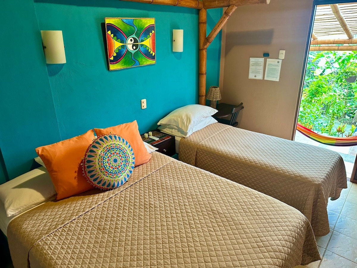 A1 | Disfruta de la tranquilidad de la playa Las Núñez. Un verdadero lugar para descansar. Tu habitación familiar privada triple tendrá baño privado, A/C, wifi y Vista a la montaña. Podrás compartir con otros huéspedes la piscina, área social y un mirador. Contamos con área de video compartida y karaoke. La habitación está dentro de las instalaciones del Hotel Estación del Sol. Como en la foto, tenemos dos camas. Una matrimonial de dos plazas, y una aérea de una plaza.