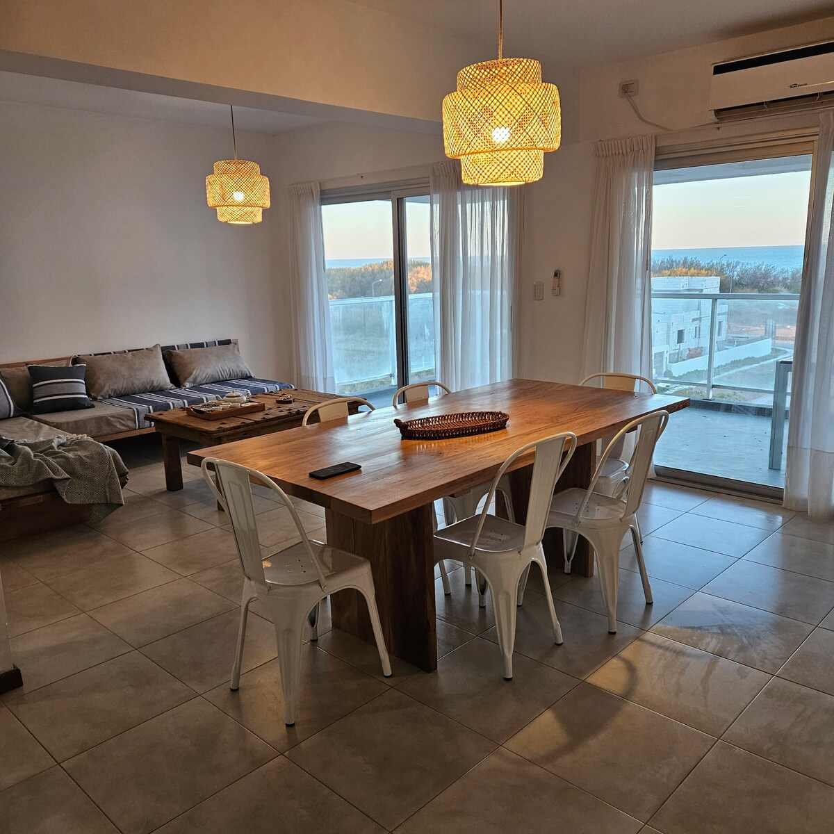 Departamento nuevo. Estilo y confort, para disfrutar amaneceres y atardeceres. Living comedor con isla y mesa de madera, 8 sillas con funda de tela y sillones. Vista panoramica al mar y la naturaleza. Cocina con equipamiento para una estadia como en casa. Dormitorio principal con amplio placard, sommier King Koil de 1,8M, sabanas de algodon marca Foyer, almohadas simil duvet, edredon y cover de percal. TV 50", AA, blackout y roller screen. Y cuenta con baño en suite.