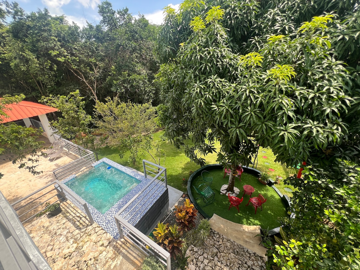 La Jíbara ✨ una casita de campo cerca de la ciudad, construida para el disfrute familiar por un psicólogo clínico experto en manejo de estrés, la casa se ubica en el punto más silencioso de la propiedad, donde el sol la acaricia de forma perfecta sin invadir las ventanas; una escapada al campo cerca de la ciudad. La casa cuenta con seguridad 24/7, el balneario de Río Caabon a 1km.