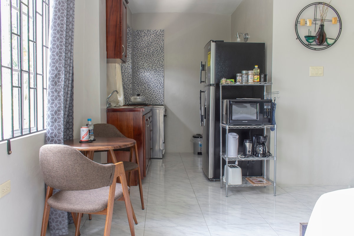Moderno apartamento de 1 dormitorio en la planta baja con todas las comodidades modernas que necesitarás para una estancia perfecta. Las ventanas están equipadas con mosquiteras para que puedas dejarlas entreabiertas y despertarte con los sonidos de las aves locales o el olor del aire fresco jamaicano. Estás lo suficientemente cerca del aeropuerto, centros comerciales y vida nocturna, pero enclavado en las afueras para una relajación tranquila. El trayecto medio desde el aeropuerto hasta el apartamento es de 20 a 25 minutos, dependiendo del tráfico y la hora del día.