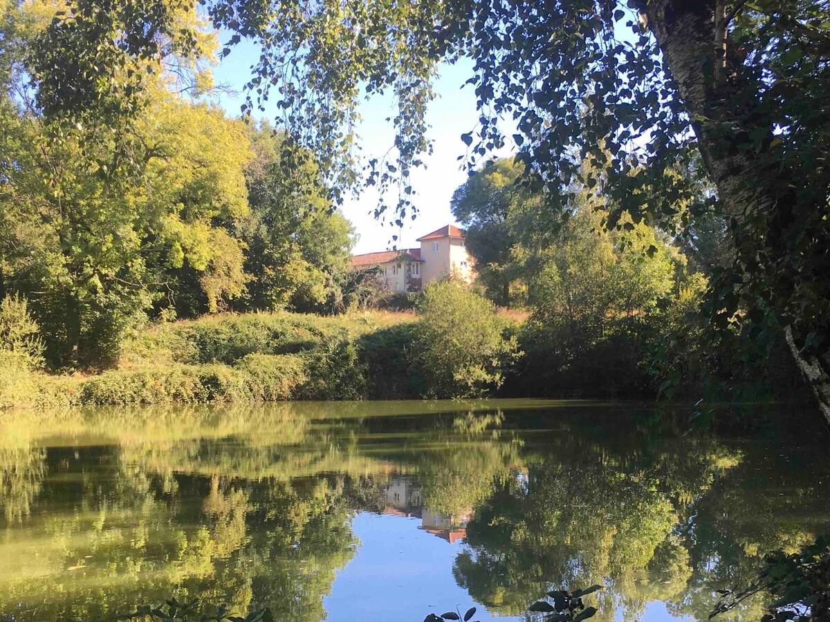 Apartamento tipo estudio de planta abierta, luminoso y espacioso, con wifi rápido. Televisor grande con Amazon Prime francés y Freeview del Reino Unido. Consola de juegos DVD y Wii y accesorios. DVD y juegos de mesa en francés e inglés. Zona de cocina con placa de cocción, microondas y horno pequeño para preparar comidas ligeras. Cuarto de ducha recién equipado, privado. Las grandes puertas de cristal se abren a una zona privada, soleada y amueblada con barbacoa, con vistas al lago y a los bosques. Parking privado Muchos senderos para caminar/montar en bicicleta desde la propiedad.
