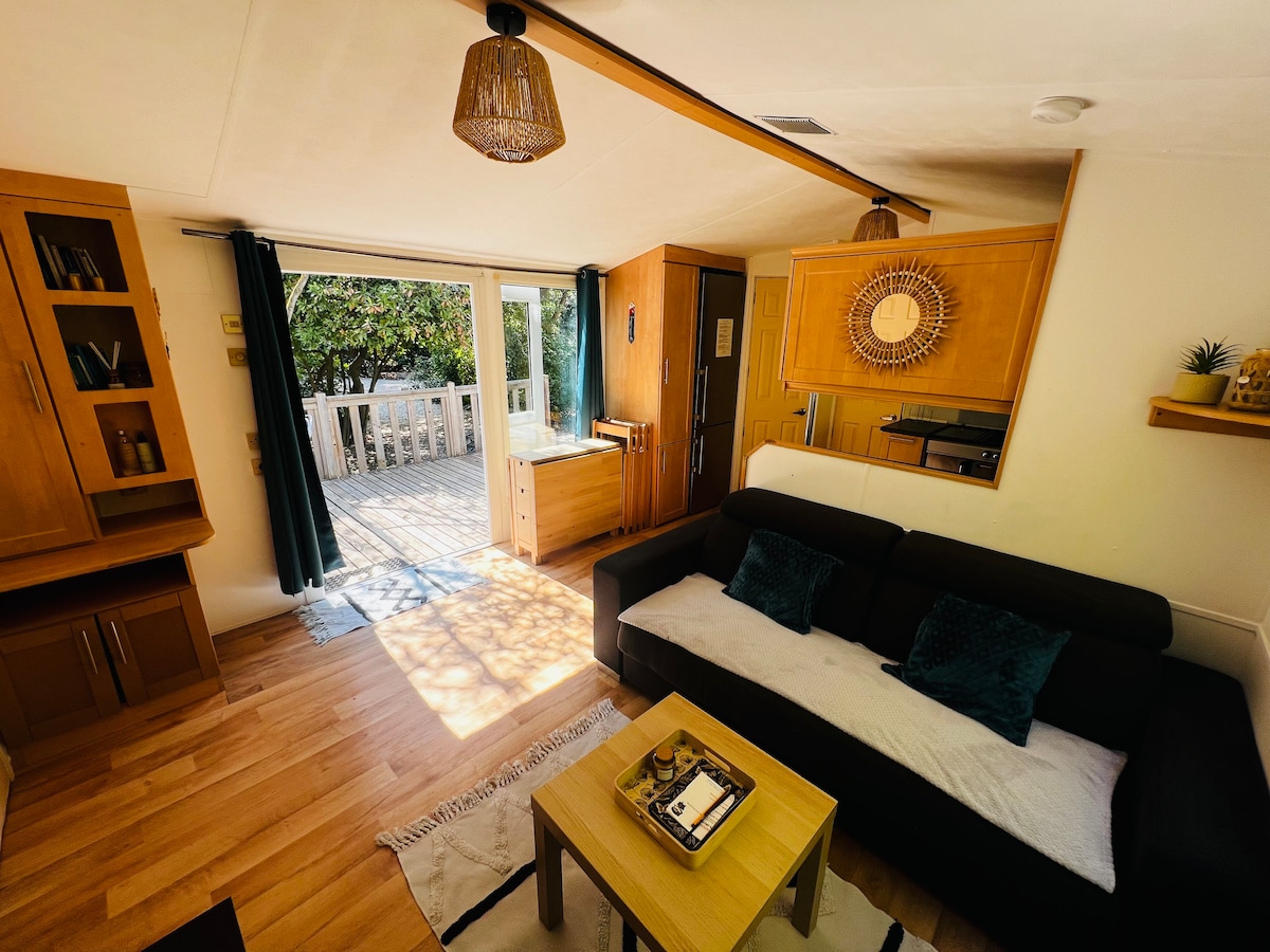 Grand mobile home neuf de 2025, avec wifi, capacité 6 personnes (une chambre parentale, deux chambres avec chacune 2 lits simples), deux salles de bain et 2 wc. Un grand canapé velours marine très confortable vous accueille, un espace repas à l'intérieur et un autre sur la terrasse couverte vous permet d'être dedans/dehors et de profiter de tout l'espace au calme. Les équipements sont de qualité, dans des tons neutres et élégants, avec en prime un superbe jardin paysagé et 2 places de parking.