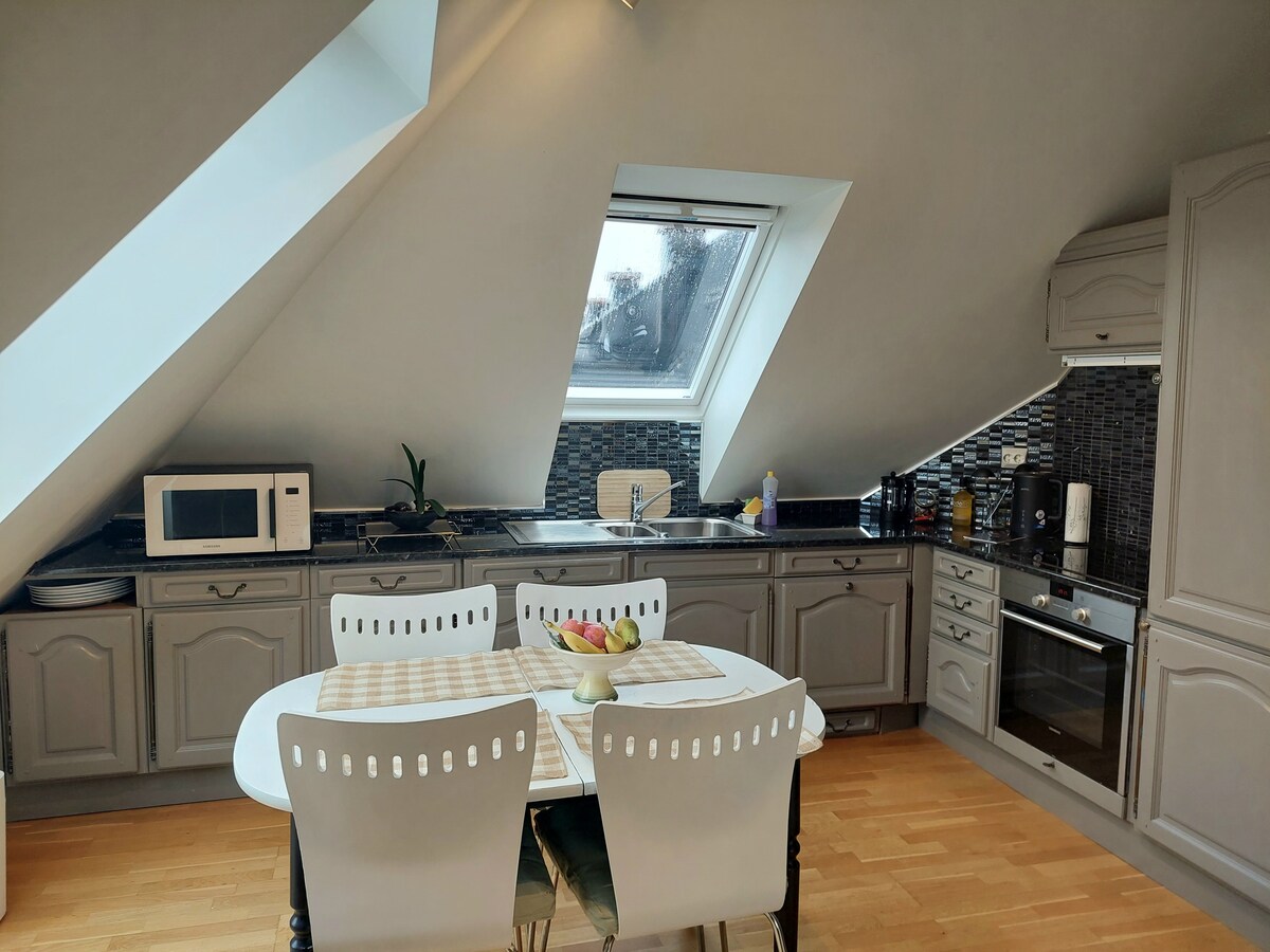 Comience su próxima aventura en nuestro pintoresco departamento en la azotea de 3 habitaciones en el corazón de la ciudad. Aquí serás recibido con increíbles vistas sobre Kristiansund. Está totalmente equipado para estar lejos de casa. ¡La cocina está totalmente equipada con electrodomésticos y todo lo necesario para tomar café todas las mañanas! Disfruta de tus comidas juntos alrededor de la mesa del comedor o relájate en el cómodo espacio que incluye un televisor de pantalla plana. Hay estacionamiento privado gratuito de 1 auto detrás del edificio. Esperamos verte pronto.