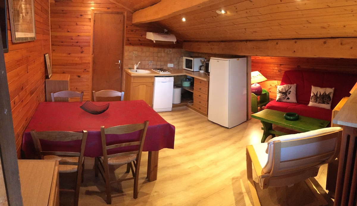 Este apartamento se compone de la siguiente manera: - Un hermoso espacio para vivir en el ático (dormitorio/sala de estar) con zona de estar de 2 sillones - Una cocina equipada: 2 placas de cocción, utensilios de cocina, microondas, parrilla, hervidor de agua, cafetera, mininevera con espacio para congelador, vajilla y cubiertos, aparato de raclette para 2 personas - Una sala de ducha+wc - Acceso independiente - 1 plaza de aparcamiento Puesta a disposición del garaje/sala de calderas para almacenar esquís, zapatos, bicicletas, ropa de esquí, etc.