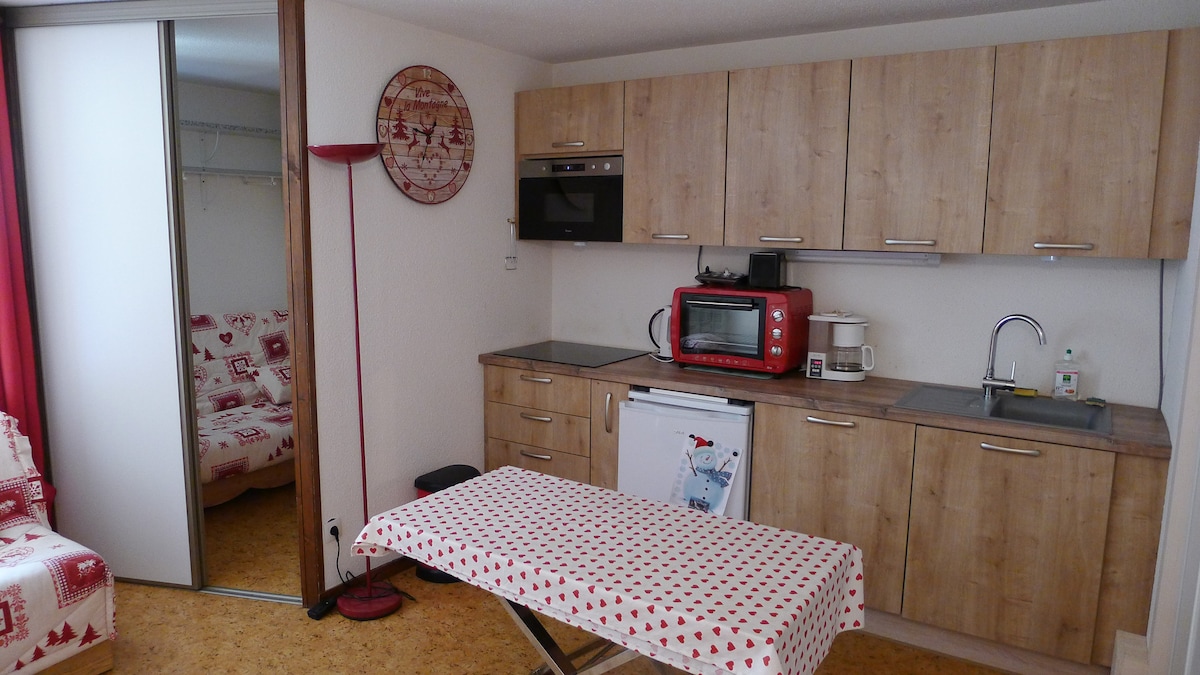 Estudio de 4 plazas con una sala de estar equipada con un sofá cama, una zona de comedor y acceso a un pequeño balcón con una bonita vista del lado de la montaña. El apartamento tiene una zona de montaña separada con una litera, una pequeña cocina totalmente equipada que incluye un lavavajillas, un baño y un aseo separado, todo en 22 m2. Este apartamento está situado en el segundo piso de un edificio completamente renovado en 2024 situado a 50 metros del telesilla y de los pies de las pistas. Dispone de casillero para esquís