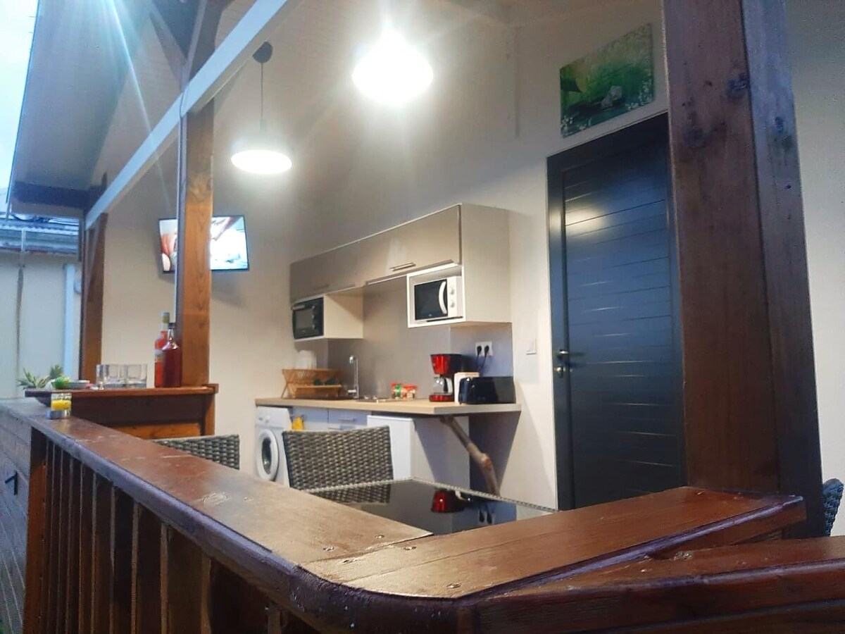 Casa de madera de 50 m2 con terraza, 4 personas máximo, piscina de relajación privada con surtidores de spa en una tranquila zona residencial situada en el campo. A 5 minutos del museo Edgar Clerc, a 8 minutos del centro comercial Baie Side, a 15 minutos de la playa de l'Autre Bord y a 20 minutos de la Puerta del Infierno. Relájese en este alojamiento tranquilo y elegante, donde le harán sentir como en casa. Alojamiento para no fumadores. Se prohíben las fiestas. No hay decoración para los cumpleaños. Piscina sin calefacción. LLEGADA A PARTIR DE LAS 15:00 H.