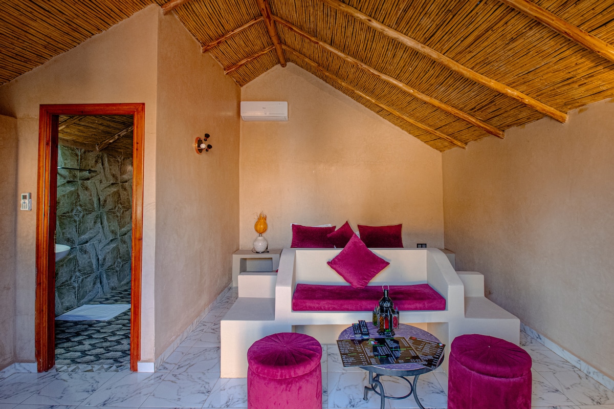 Dar Imane dispose de 4 Bungalows, située à proximité de la ville de Ouarzazate avec une vue majestueuse sur les montagnes de l'atlas. La Maison dispose d'une magnifique piscine, d'un grand jardin avec des arbres fruitiers et d'un potager. Le petit-déjeuner est inclus dans le tarif. Nos repas déjeuner et dîner peuvent être servis dans le jardin autour de la piscine ou dans le salon de la maison. Pour égayer votre séjour, nous proposons des cours de cuisine, randonnées et excursions à Merzouga.