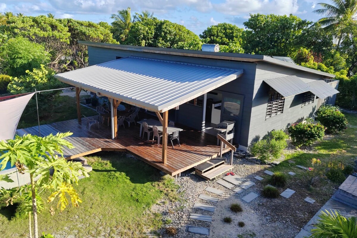 Bienvenido a Escale Hina, tu espaciosa villa en Rangiroa, rodeada de un jardín, una cancha de petanca y una piscina privada, perfecta para relajarte después de tus inmersiones o excursiones a la laguna. La casa es ideal para parejas, familias o amigos, con capacidad para 6 personas. La tarifa base se aplica a 2 huéspedes. Se aplica un cargo adicional por cada huésped adicional (de la tercera a la sexta persona). 1 bebé (menor de 2 años) se aloja gratis, con una cuna de viaje incluida.
