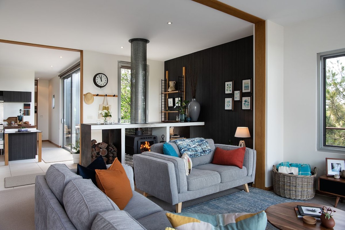 A secluded and intimate luxury escape inspired by the need to live smaller and more sustainably, Monterey is an eco-friendly off-grid tiny house nestled amongst 35 acres of native forest offering guests the perfect opportunity to explore nature, unwind and recharge. Built from salvaged Monterey Cypress timber, the house offers a dreamy king sized bed downstairs with floor to ceiling windows. Explore the surrounding forest and wildflowers and immerse yourself in the sounds of nature.
