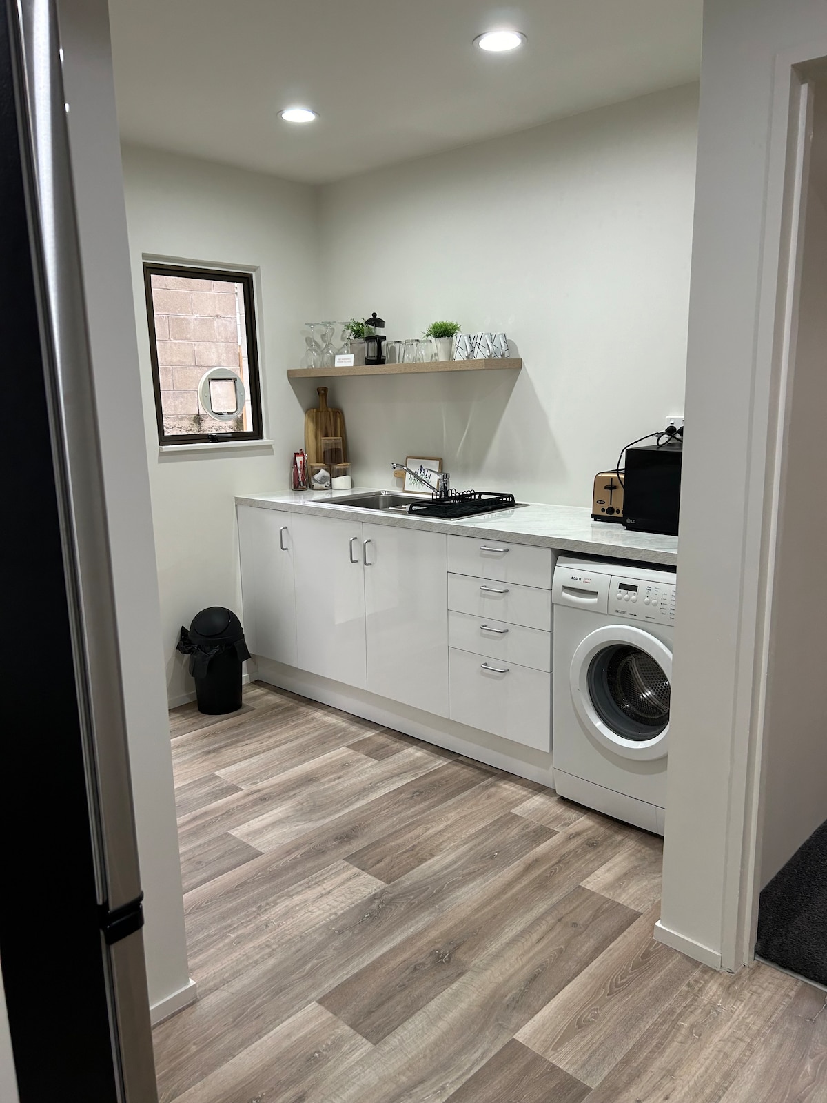 Nuevo espacio creado en la zona de abajo de nuestra casa. La zona es completamente autónoma, ¡no se puede compartir con nadie más! Salón/dormitorio con cocina americana y baño separados. Soleado y cálido, con una bomba de calor para los días más fríos. A poca distancia a pie de la calle principal (George St), el supermercado y los jardines. Muy cerca de la Universidad, Politécnico y Estadio. El espacio está configurado cómodamente para 2 huéspedes, sin embargo, se puede alojar a un tercer huésped, utilizando el sofá cama.