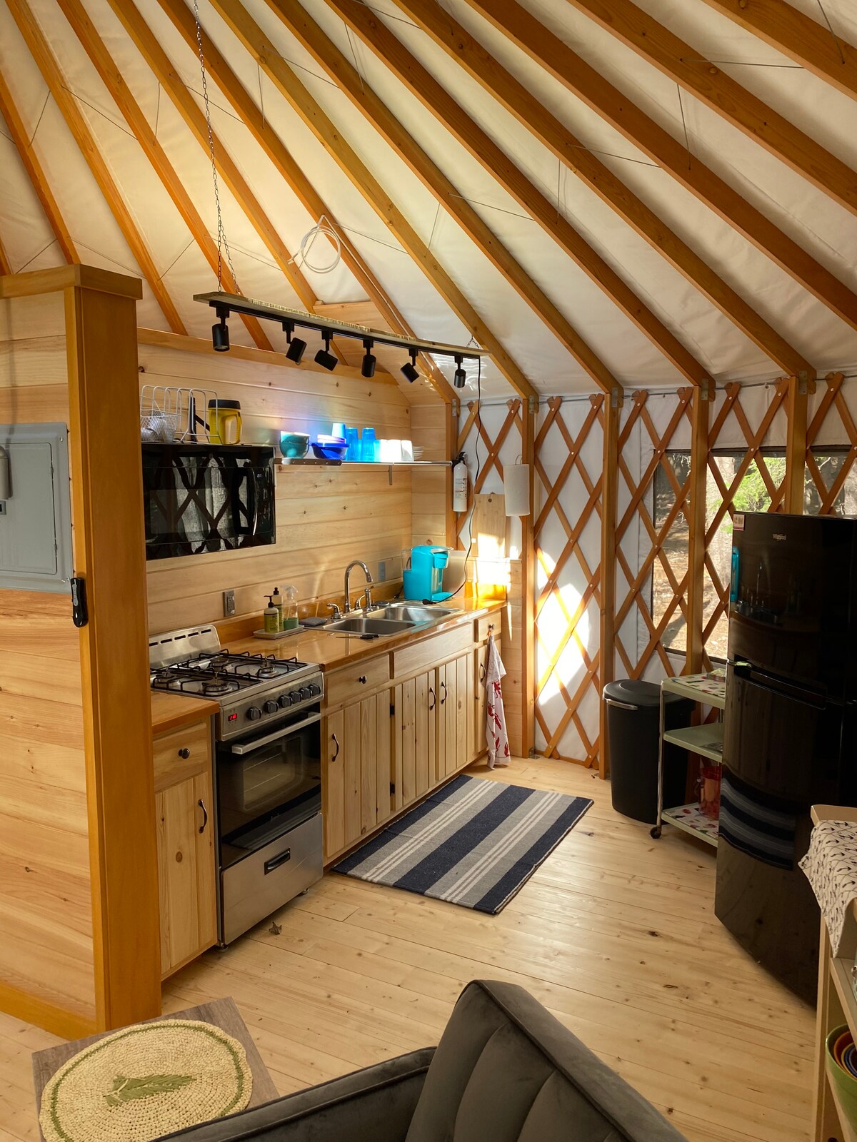 Newly Constructed. Old Acadia Ranger Yurt, a 25 ft. Yurt nestled in the pine and maple forest 1/4 mile from Long Pond and Acadia National Park hiking trails. New construction includes a full bath with a large walk-in shower, kitchen with gas stove/oven, microwave, refrigerator, dinette table w/ seating. Bedding includes, 1 Queen sized bed, 1-fold down double couch, Queen bed in loft, and 1 rollaway cot. Towels and bedding provided. Four (4) guests only (no exceptions). Pets are not permitted.