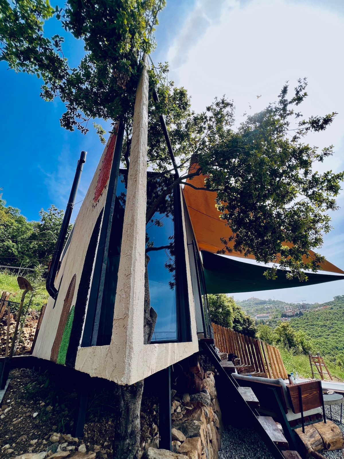 Acogedora casa del árbol privada con vistas panorámicas, bañera de hidromasaje climatizada al aire libre y proyector inteligente con Netflix. Incluye cama tamaño queen, baño completo, cocina pequeña, barbacoa, fogata, hamaca, juegos de mesa y wifi. Una de las tres casas del árbol únicas en el mismo terreno, perfecta para parejas o amigos que reservan juntos. Desayuno, bandejas de vino/queso y servicio de entrega a domicilio disponibles. Una escapada tranquila en la naturaleza, a solo 40 minutos de Beirut.