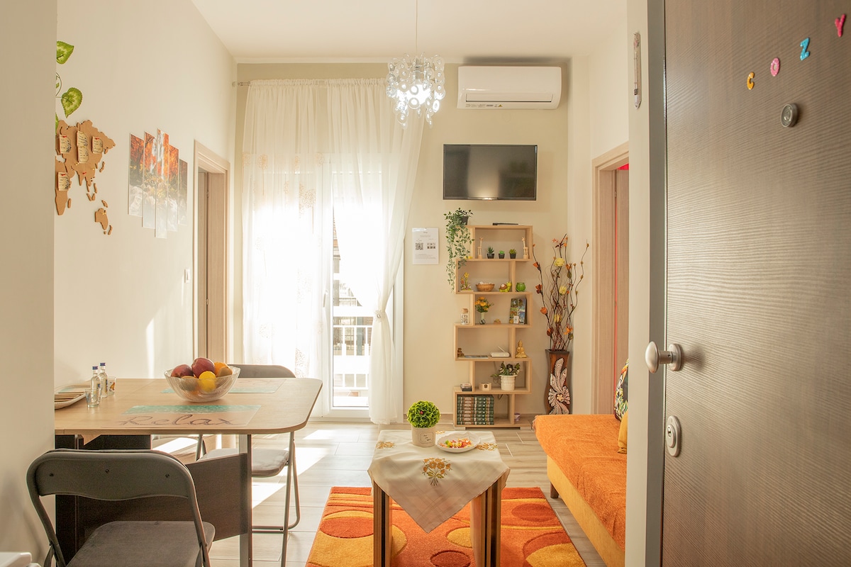 Este apartamento céntrico ofrece un alojamiento agradable en el corazón del centro de Katerini, junto a un supermercado, farmacia, restaurantes, bares y tiendas, y la plaza a solo unos pasos. Cuenta con wifi gratuito, cocina equipada, un cómodo dormitorio con cama de matrimonio y en la sala de estar tiene un sofá de tres plazas que se convierte en una cama individual. También hay un balcón con mesa y sillas para disfrutar de tu café. Opción ideal para familias, amigos, parejas o personas que viajan solas.