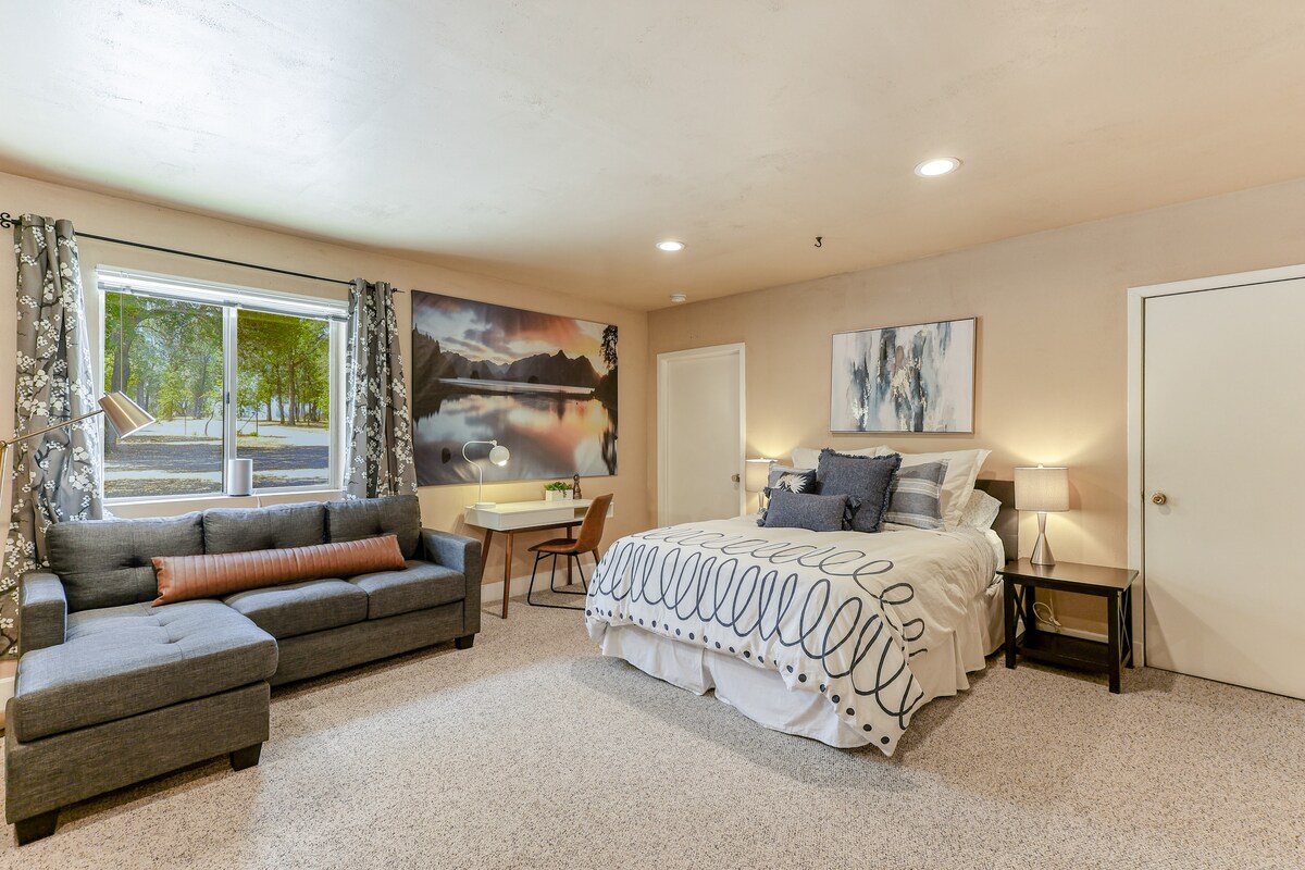 ¡Relájate y desconecta en este alojamiento tranquilo y elegante! Recientemente renovada, nuestra moderna suite de invitados se sentirá como tu hogar lejos de casa. Empieza bien el día preparando una taza de café por la mañana en el acogedor rincón del café. Disfruta cocinando un almuerzo por la tarde en nuestra cocina totalmente equipada con microondas, estufa eléctrica, nevera completa y utensilios de cocina. Situado cerca de tiendas, tiendas de comestibles, restaurantes y panaderías, justo al lado de la autopista 5 y a 3-5 minutos del centro cívico y del centro de la ciudad.