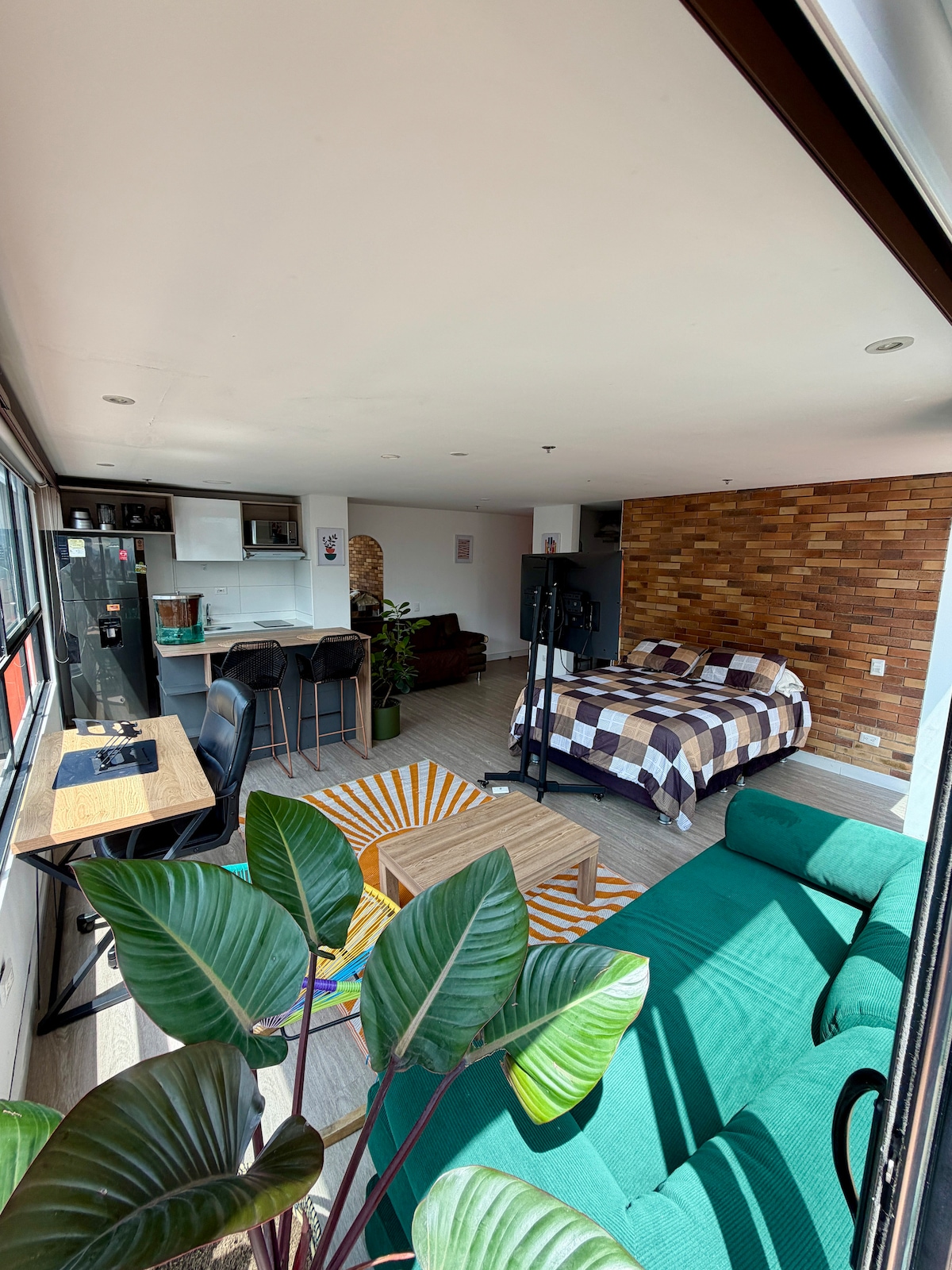 Despierta con los Cerros Orientales frente a ti. Nuestro loft está ubicado en el edificio más icónico de Chapinero, una torre de vidrio que captura la ciudad desde todos los ángulos. El apto combina diseño, amplitud y luz natural en un solo espacio. Ventanales de piso a techo, terraza privada, wifi de 600 Mbps y zona de trabajo para quienes mezclan viaje con productividad. Afuera, todo Chapinero a pie: Parque de los Hippies, Carrera7, restaurantes de autor, cafés de especialidad y vida nocturna.