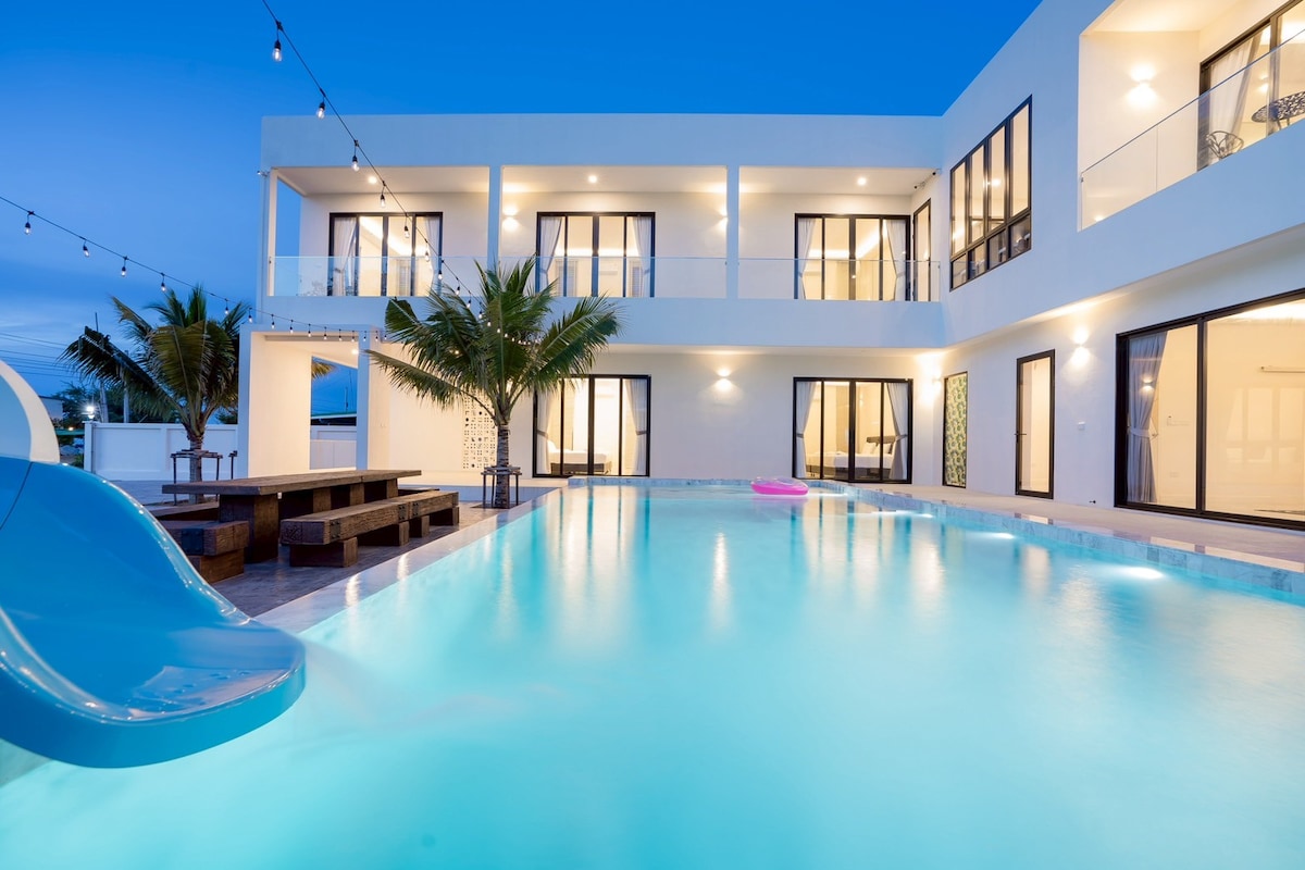 Villa con piscina privada respondiendo a todas las necesidades de relajación Vino con familiares y amigos. Relájate juntos en un lugar tranquilo. Cerca de la playa, camina a través de la carretera a solo 100 metros. A solo 2 horas de auto de Bangkok y a 1 hora de Hua Hin.
