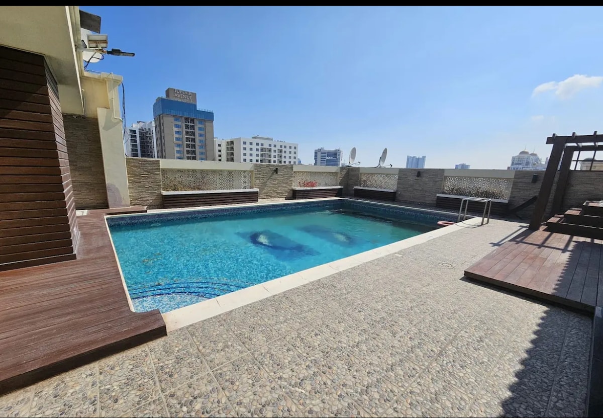 Apartamento tranquilo y céntrico de 2 dormitorios en Juffair, con balcón y vistas al mar. Las instalaciones incluyen piscina, gimnasio, billar, ping-pong, área de juegos para niños, vapor y sauna. Se proporcionan artículos de lavado desechables gratuitos.