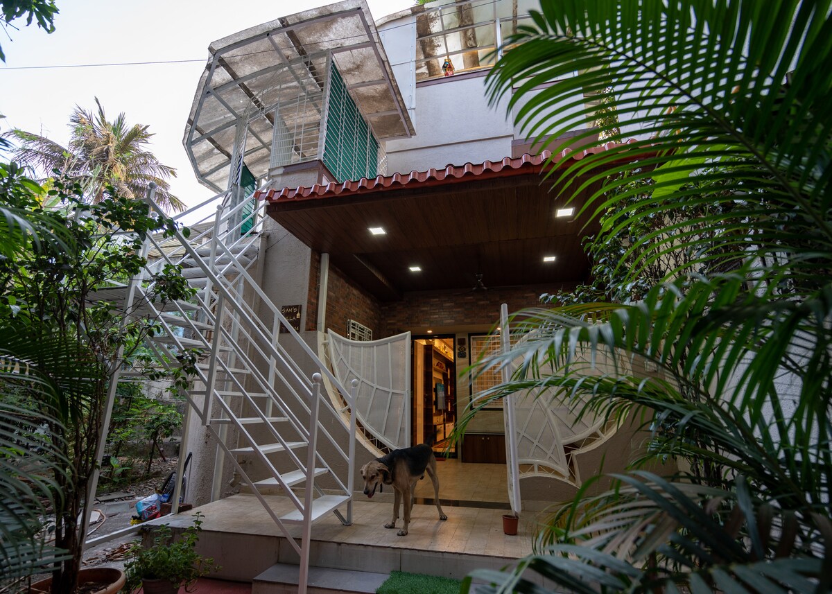 Este espacio único irradia lujo en la famosa reserva del parque nacional de Mumbai que preserva gran parte de la flora y fauna de la ciudad. Es un bungalow de 3 plantas en el que 2 pisos están disponibles para los huéspedes. Rodeado de naturaleza pero accesible a la ciudad, (a un minuto de la carretera exprés occidental/transporte público), es el lugar perfecto para una estancia cómoda y relajante cerca de la acción de Bombay. El apartamento ofrece una amplia sala de estar con baños privados, agua caliente, camas tamaño queen y aire acondicionado.