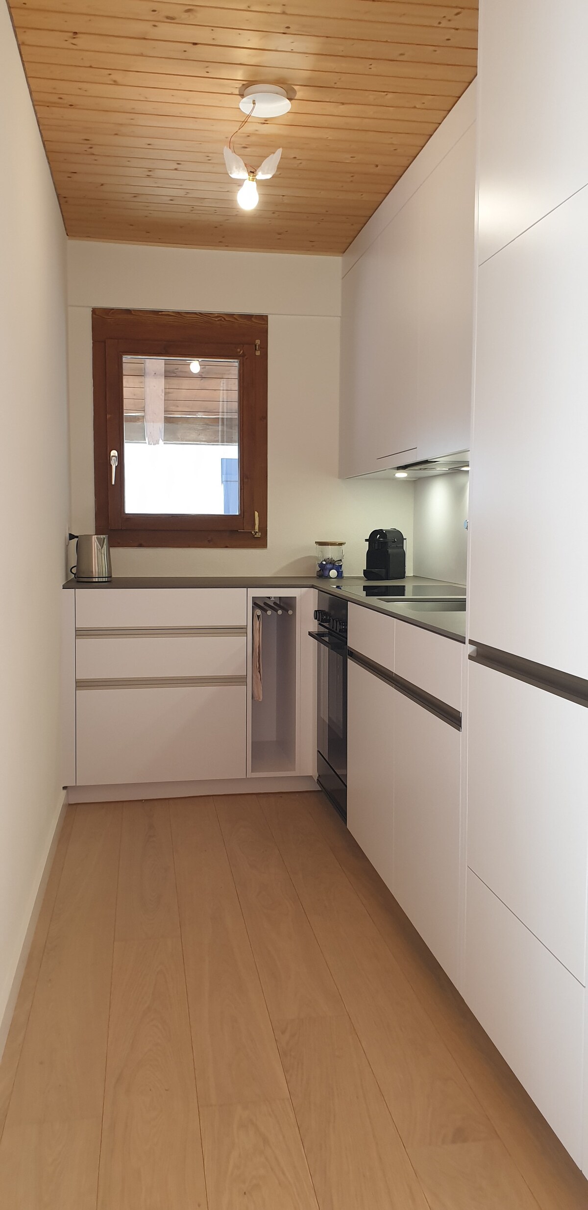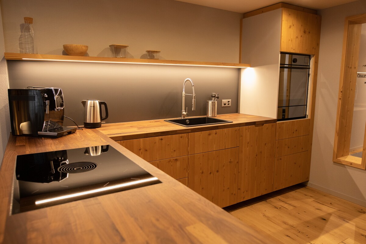 This new chalet is perched above the car free village of MURREN in the Bernese Oberland outside charming Interlaken. The apartment is the lower floor of the chalet with a spacious living/dining room and large windows that look across the spectacular Lauterbrunnen Valley with its 72 waterfalls to the North Face of the Eiger and the Jungfrau Massif. It offers the best view of any chalet rental in Murren. The Master Bedroom has a king bed and 2 walk in closets leading to the bathroom with shower and tub. On the edge of the living room is a queen wall bed, so the apartment comfortably sleeps 4 . The fully equipped modern kitchen has granite counter tops, dishwasher, 4 burner stove and oven. The fridge has a freezer. There is a bar with bar stools. The chalet has a wood burning stove and radiant floor heating. In the winter, guests can walk 8-10 minutes to the Allmendhubelbahn or 2 minutes to the BLM station for a quick train ride to the quad lift at Winteregg. We offer you free ski lockers and boot warmers.. You will love this space in the typical charming Swiss village of Murren. We're adjacent to a wildlife preserve, with occasional sightings of graceful charming Chamois, so we cannot accommodate dogs or cats. If you want spacious, quiet, private, cozy and spectacular, this place is for you. World famous hiking and skiing are at the doorstep. And a Peace you've never before experienced. After you check in, you'll be welcomed by our wonderful Property Manager Liza who will help you fill out the Kurtaxe form. While we pay the Kurtaxe for you, you need the filled out form in order to pick up the "Kurkarte" ID card at the Sports Center. With this card you can enjoy the free indoor swimming pool/hot tub plus free ice-skating in the winter. You can also benefit from discounts at various stores.