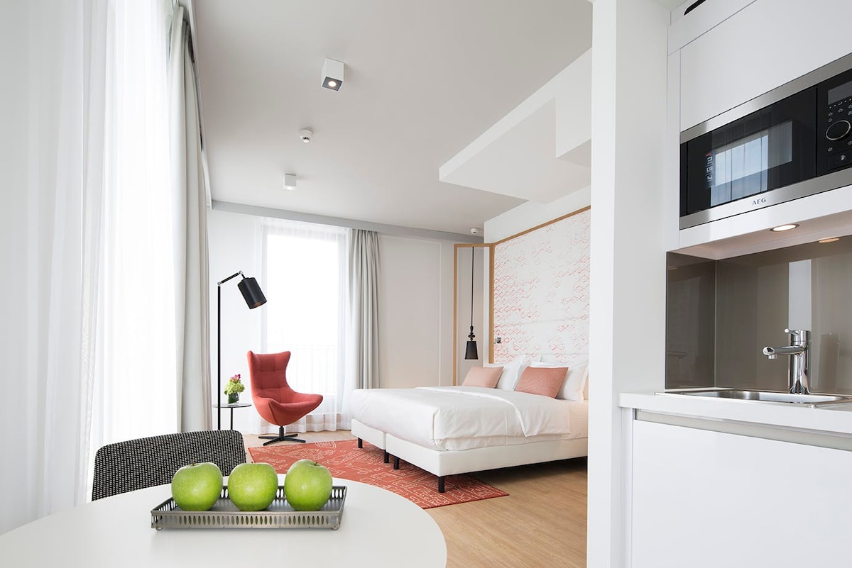 Aparthotel con recepción. Con nuestros estudios loft en Nena Apartments Metropolpark Berlin, has encontrado un gran lugar para alojarte en Berlín. Aquí, los elementos históricos se combinan con el diseño urbano en el edificio catalogado, en una ubicación privilegiada pero tranquila en el moderno distrito de Mitte. Loft Studio con una sala de estar combinada. No se permiten fiestas o eventos. *ejemplo de fotos*