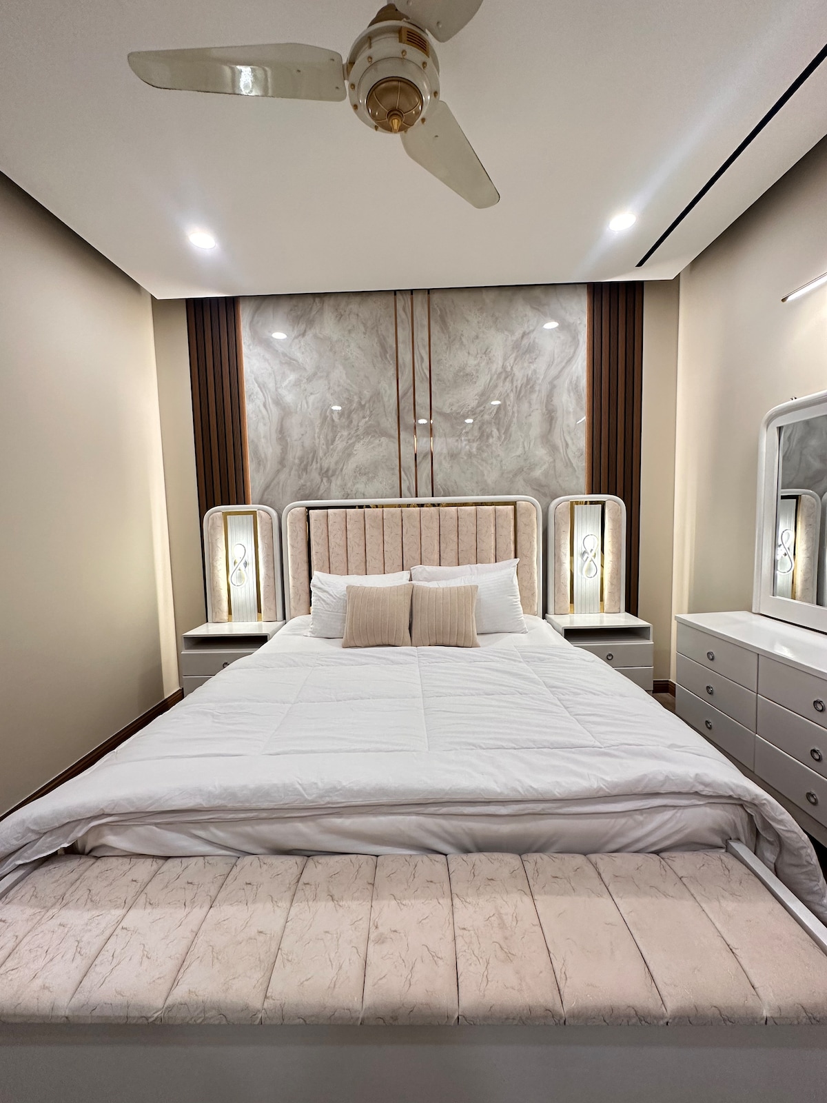 Te damos la bienvenida a tu lujoso hogar lejos del hogar en el prestigioso sector de FMC de B-17, Islamabad. Este apartamento 1 BHK bellamente diseñado cuenta con interiores modernos y de alta gama que combinan comodidad y estilo, por lo que es perfecto para viajeros de negocios, parejas o huéspedes solos que buscan una experiencia premium. El departamento está totalmente equipado con todos los servicios esenciales, incluido un amplio salón, una cocina elegante y un dormitorio acogedor. Este departamento tiene 2 aparatos de aire acondicionado 🆒 perfectos para el verano. 🏝️