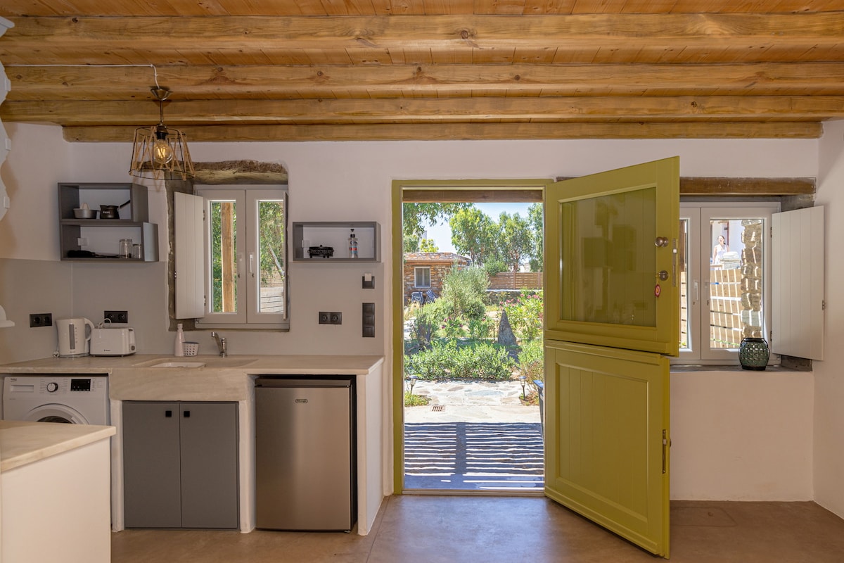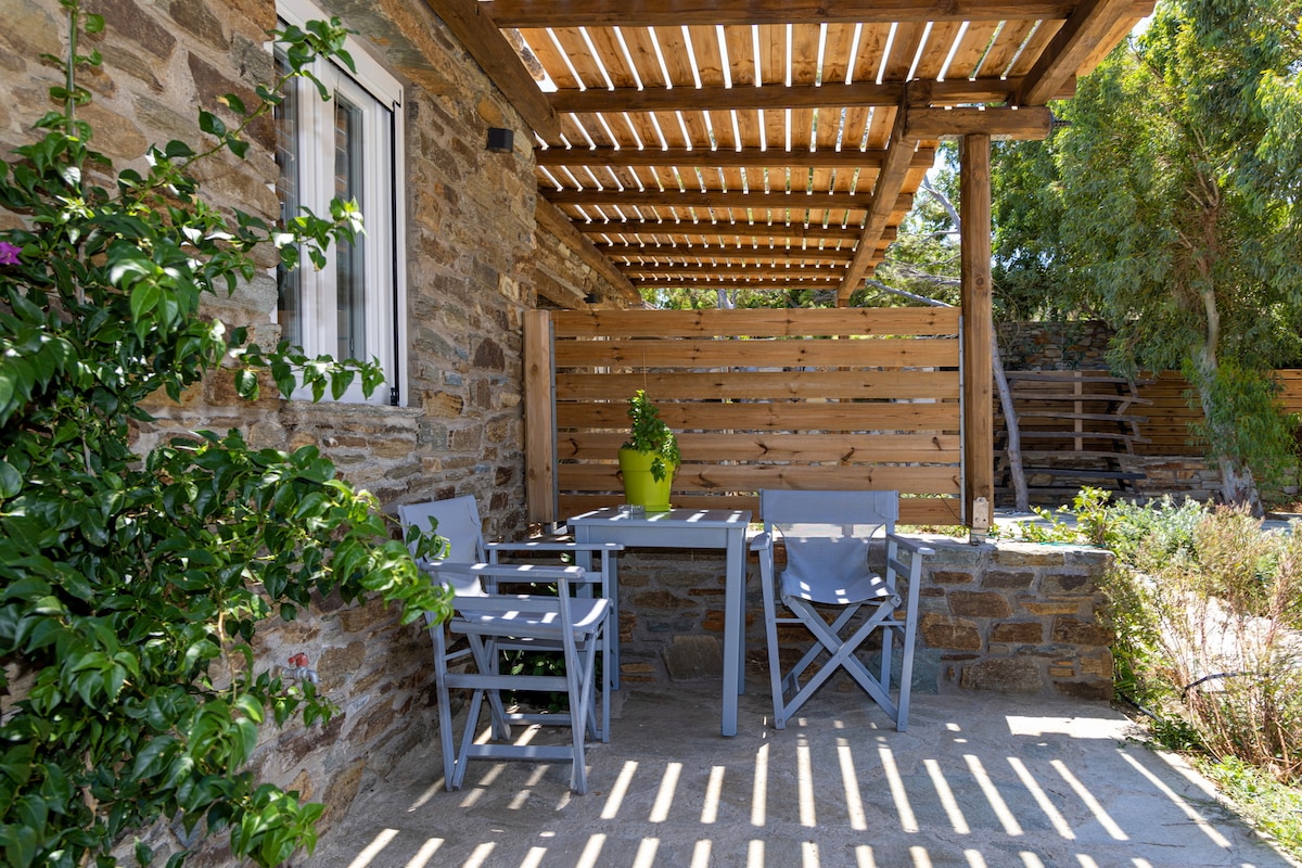 Un hermoso apartamento pequeño muy cerca de una playa de arena. Con una cómoda cama doble, así como una o dos camas más para alojar hasta 4 personas. Tiene un patio acogedor con vistas a la colina vecina con casas isleñas. Parte del patio está cubierto para proporcionar sombra, frescura y una estancia cómoda. Elección ideal para vacaciones asequibles en uno de los asentamientos más hermosos de Tinos.