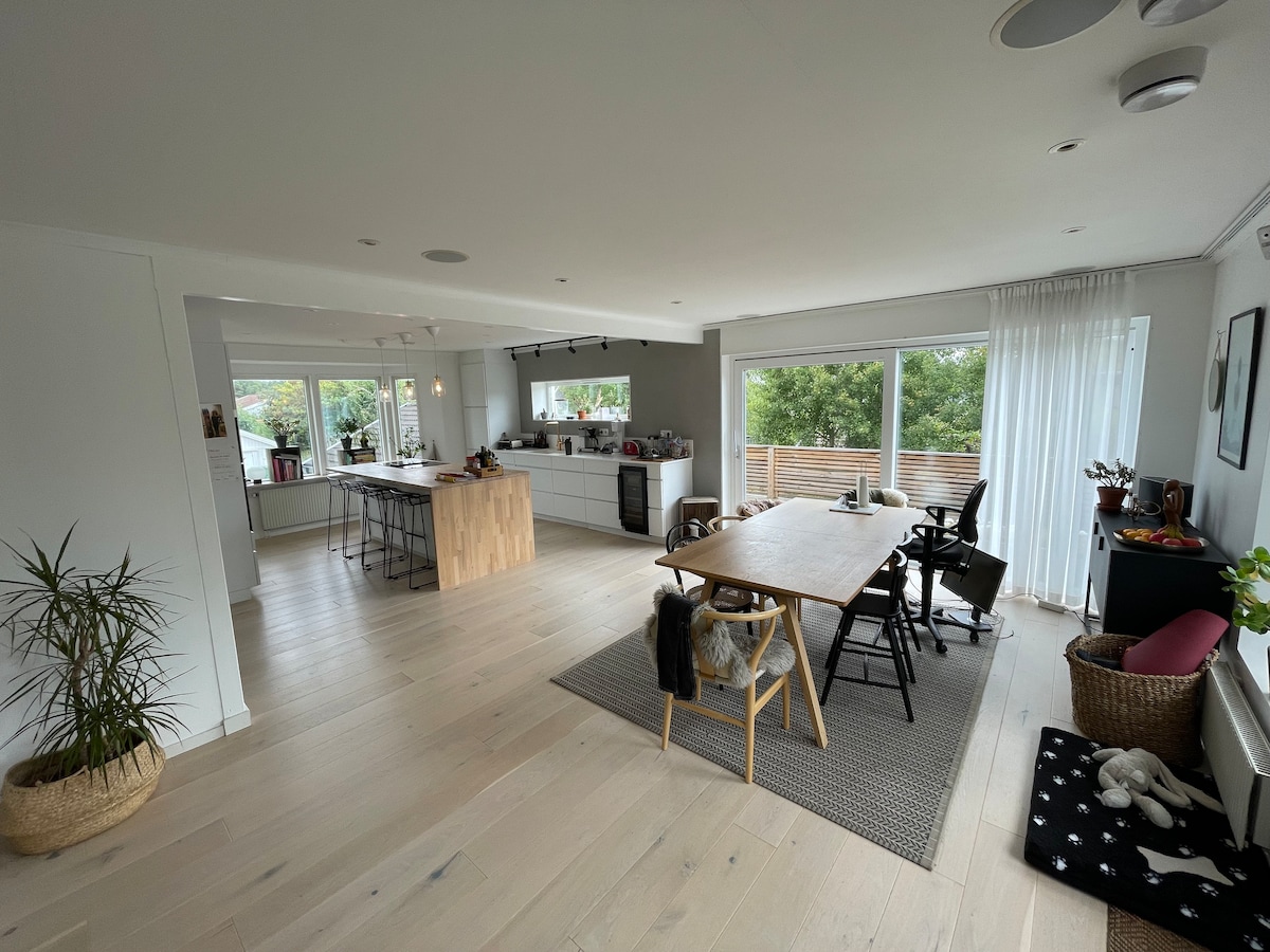 Villa artística a 11 km del centro de Estocolmo. El estilo es ecléctico, moderno con muchas obras de arte en las paredes, así como otros objetos de diseño y chimenea. Cocina lujosa recién renovada. El amplio salón tiene un televisor LED de 75 pulgadas, con Netflix, HBO, Apple TV y Chromecast. Spa de hidromasaje con masaje para una familia. Wifi, una plaza de aparcamiento... Barrio muy seguro. Cerca de un parque forestal con una mansión del siglo XVI con una cafetería. También cerca de panadería de primera categoría + 2 tiendas de alimentos y 5-6 restaurantes.