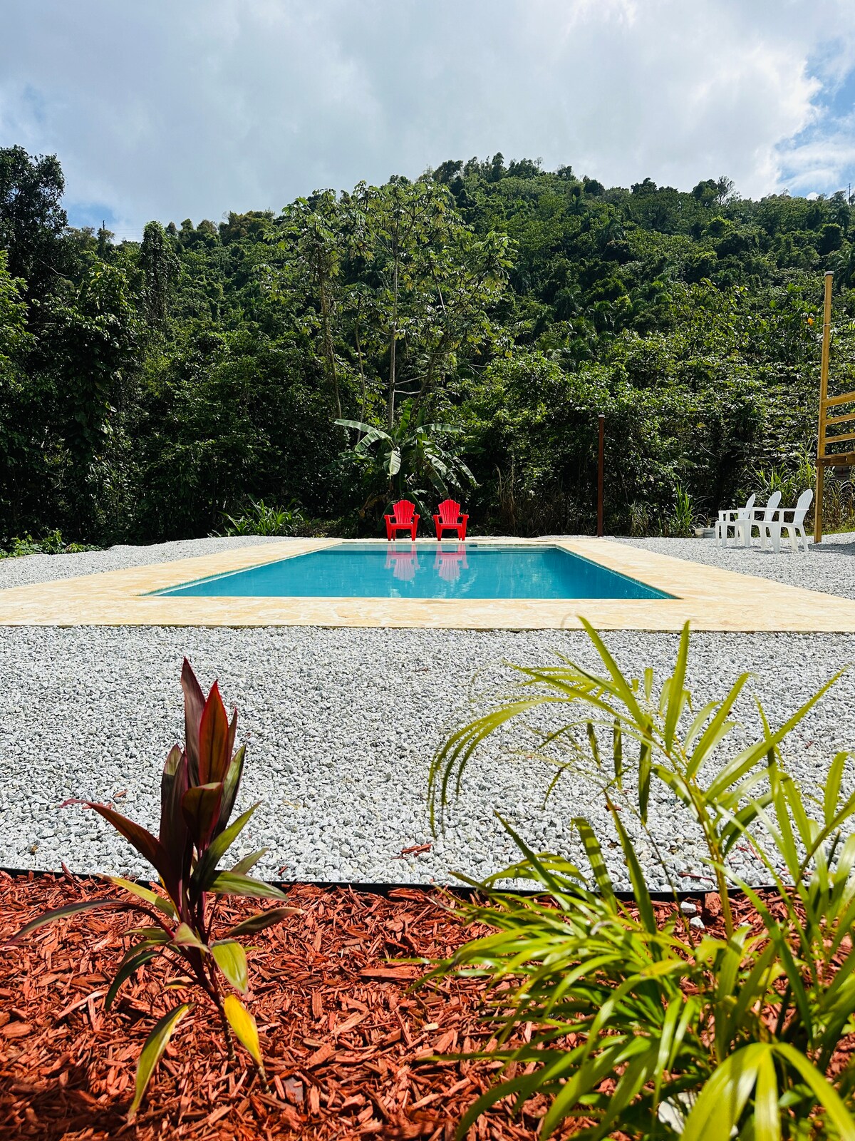 Casa el Yunque offers a serene retreat nestled within the breathtaking landscapes of El Yunque National Rainforest. With two cozy rooms and AC, one bathroom with hot water, and a refreshing pool 5 feet deep, The house has solar panels and a water tank. Enjoy nature's tranquility with a nearby private river, perfect for relaxation or adventure. The deck offers a beautiful spot for and outdoor dining. Experience the ultimate getaway at Casa el Yunque, where nature meets luxury.