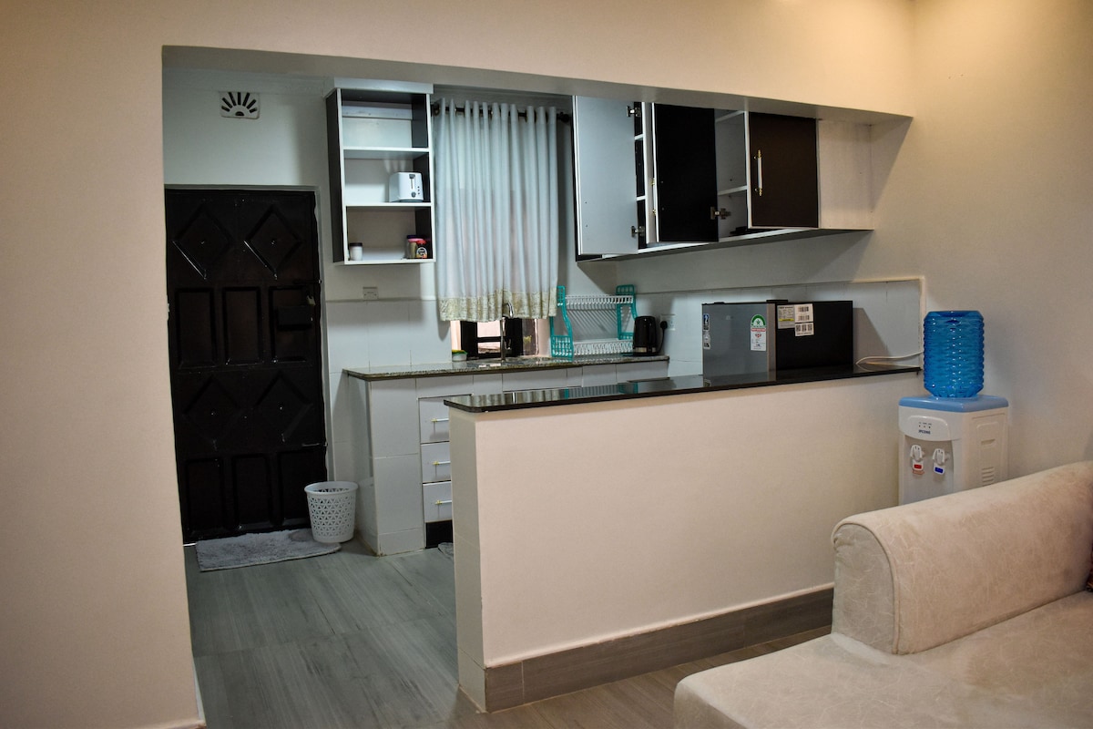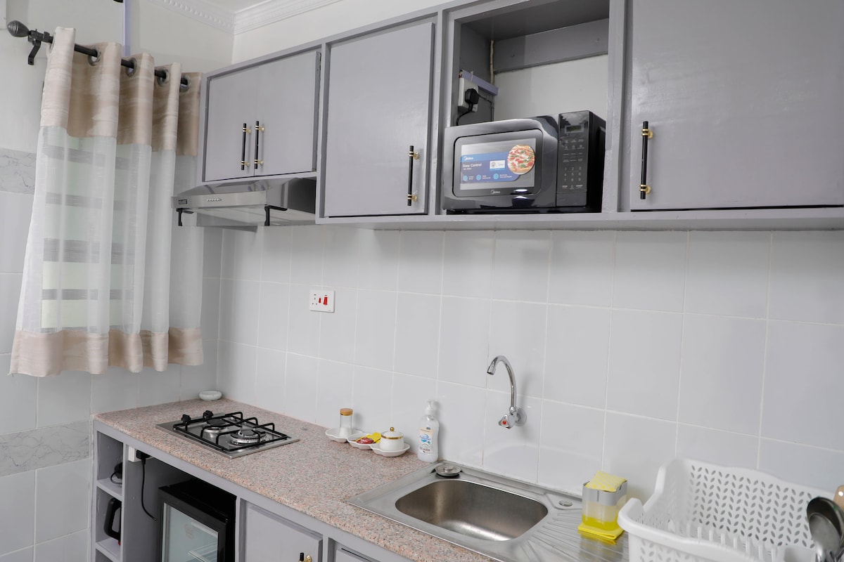 One-bedroom suite featuring a queen-size bed, private living room with Netflix, a fully equipped kitchen, hot shower, fast Wi-Fi, and free on-site parking. Located just 2 km from Nakuru CBD, 1.5 km from Westside Mall, and 3 km from Lake Nakuru National Park. Enjoy easy access to all that Nakuru has to offer! Our friendly building staff are always available to assist whenever you need. Check out Mordern Guest Suite A which is also available for booking. Studios & a 2BR unit also available.