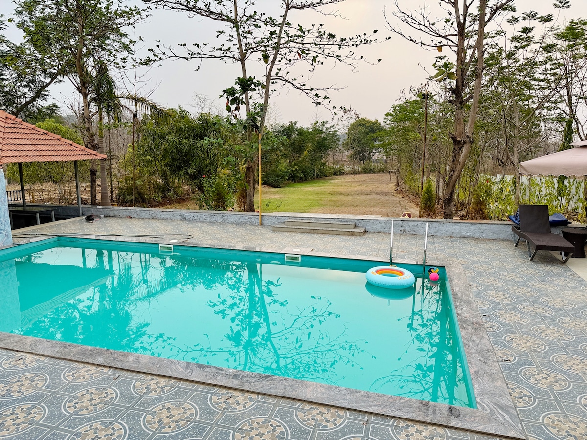 Experience a serene retreat, a picturesque 3-BR 4-Bath farmhouse in Nasrapur, Karjat. This haven, adorned by lush greenery, features a pool, a flowing river & featured in Hotelier India. Crafted with love, the rustic design offers spacious, open areas, inviting a sense of freedom & communion with nature—an ideal escape for a city detox. It stands out for commitment to environmental sustainability. This villa can sleep 15 guests overnight & 30 guests for the day making it ideal for parties.
